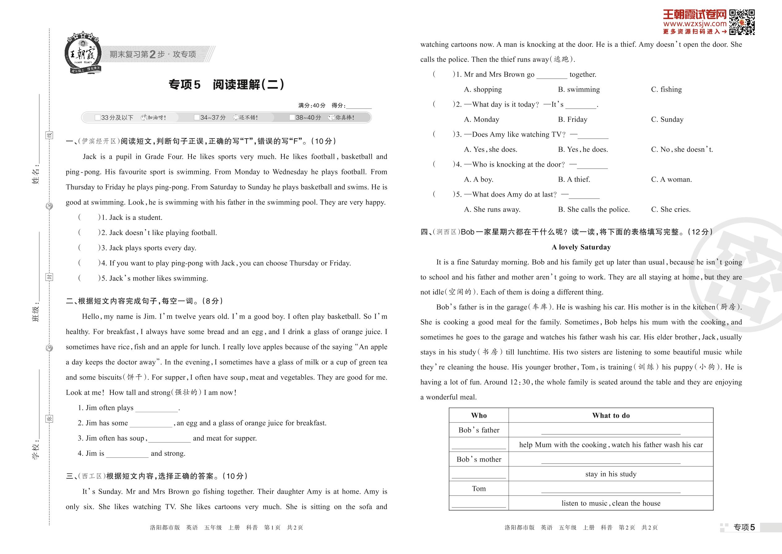 王朝霞期末专项卷——阅读理解(二)五年级上册英语(科普版)【5】