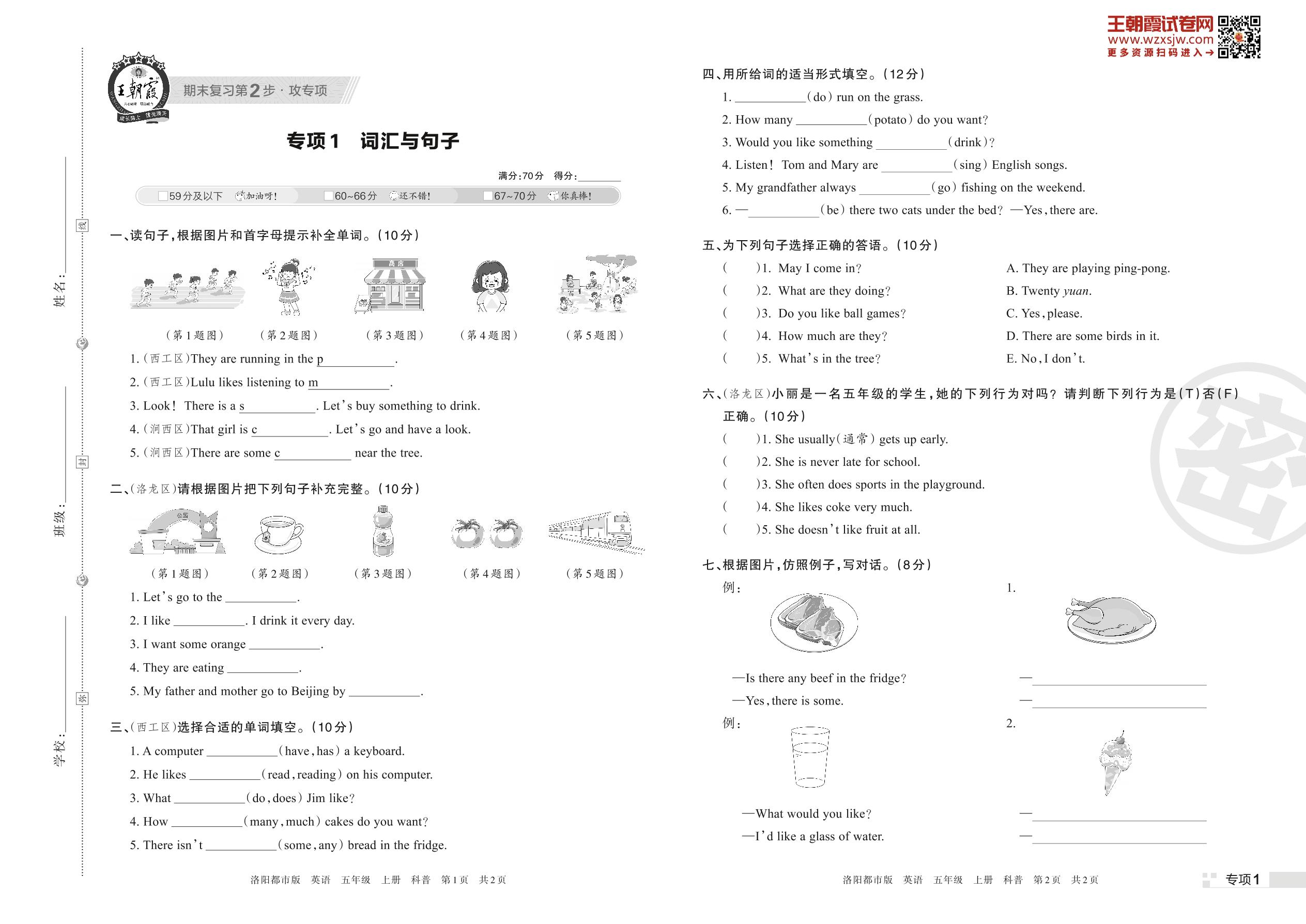 王朝霞期末专项卷——词汇与句子五年级上册英语(科普版)【1】
