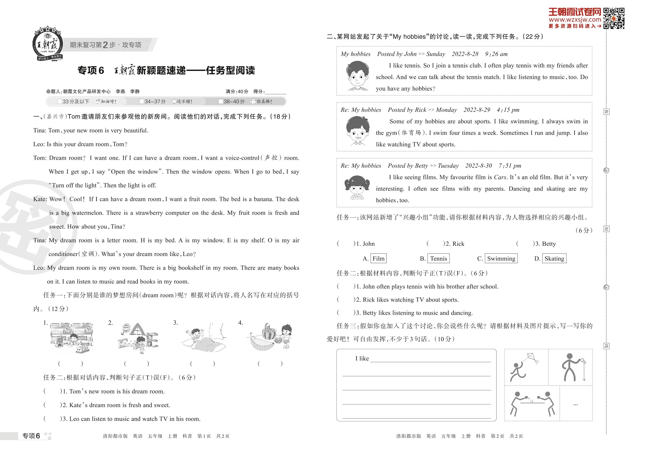 王朝霞期末专项卷——王朝霞新颖题速递:任务型阅读五年级上册英语(科普版)【6】