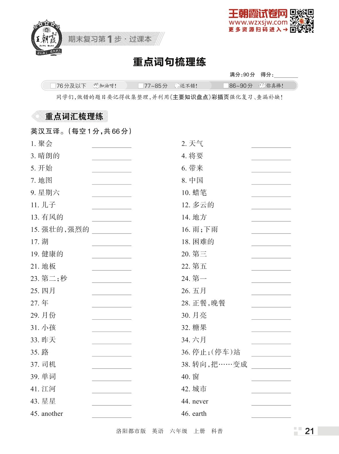 王朝霞期末过课本——重点词句梳理练六年级上册英语(科普版)