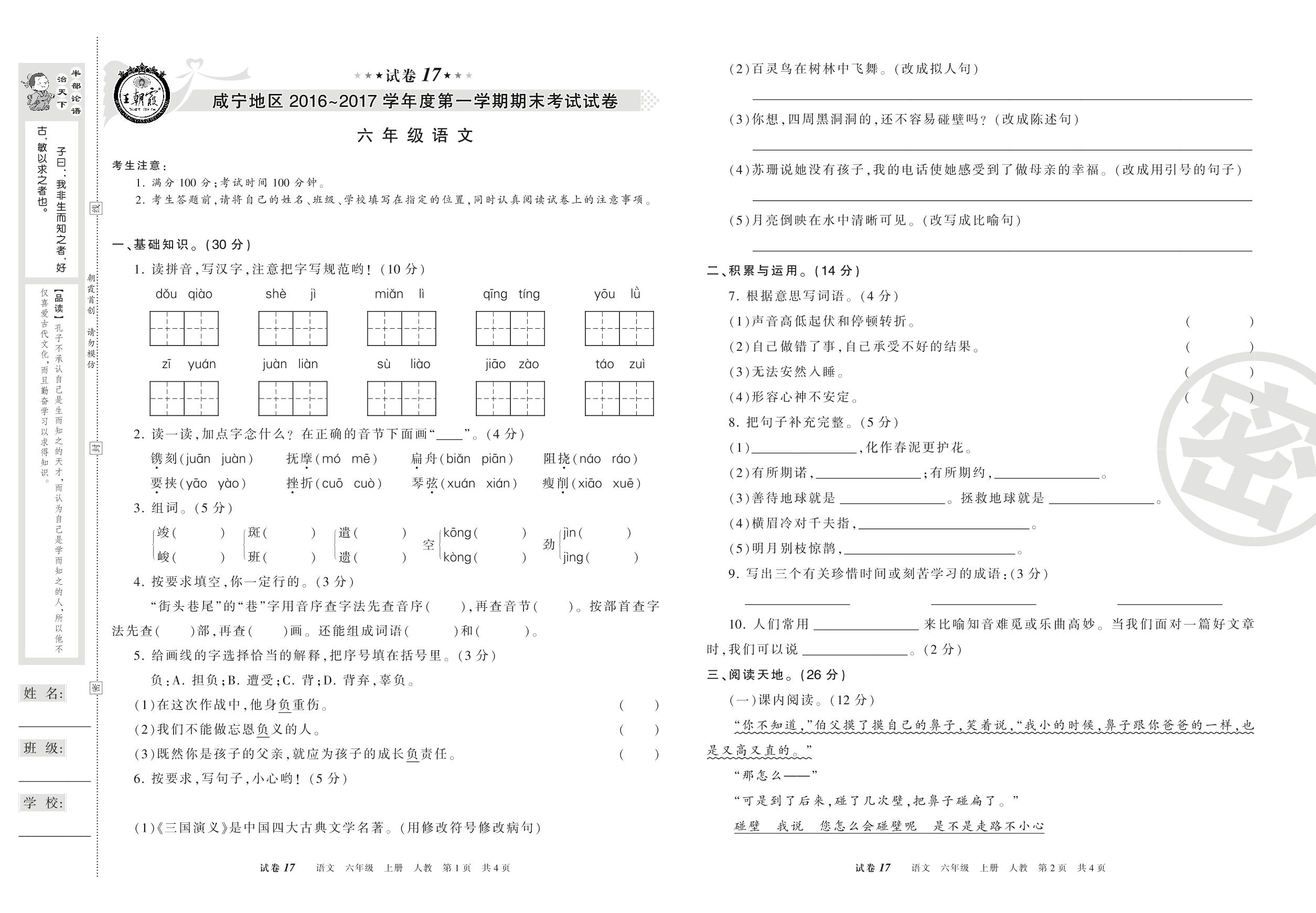 2016-2017学年第一学期咸宁市咸宁地区六年级语文试卷(人教版)【17】