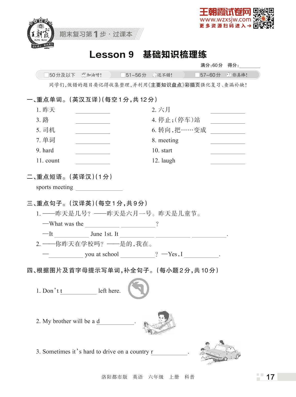 王朝霞期末过课本——Lesson 9 基础知识梳理练六年级上册英语(科普版)