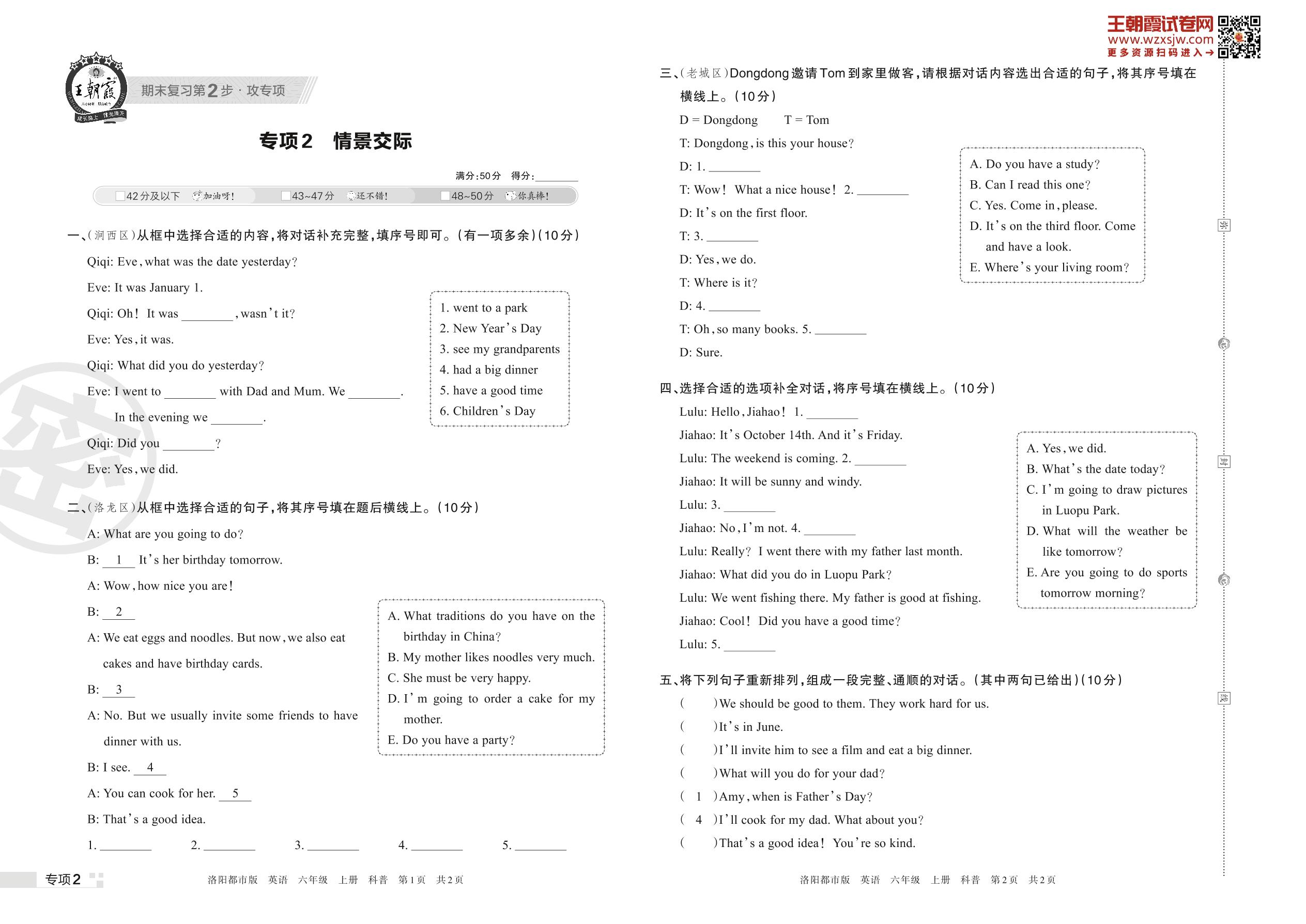 王朝霞期末专项卷——情景交际六年级上册英语(科普版)【2】