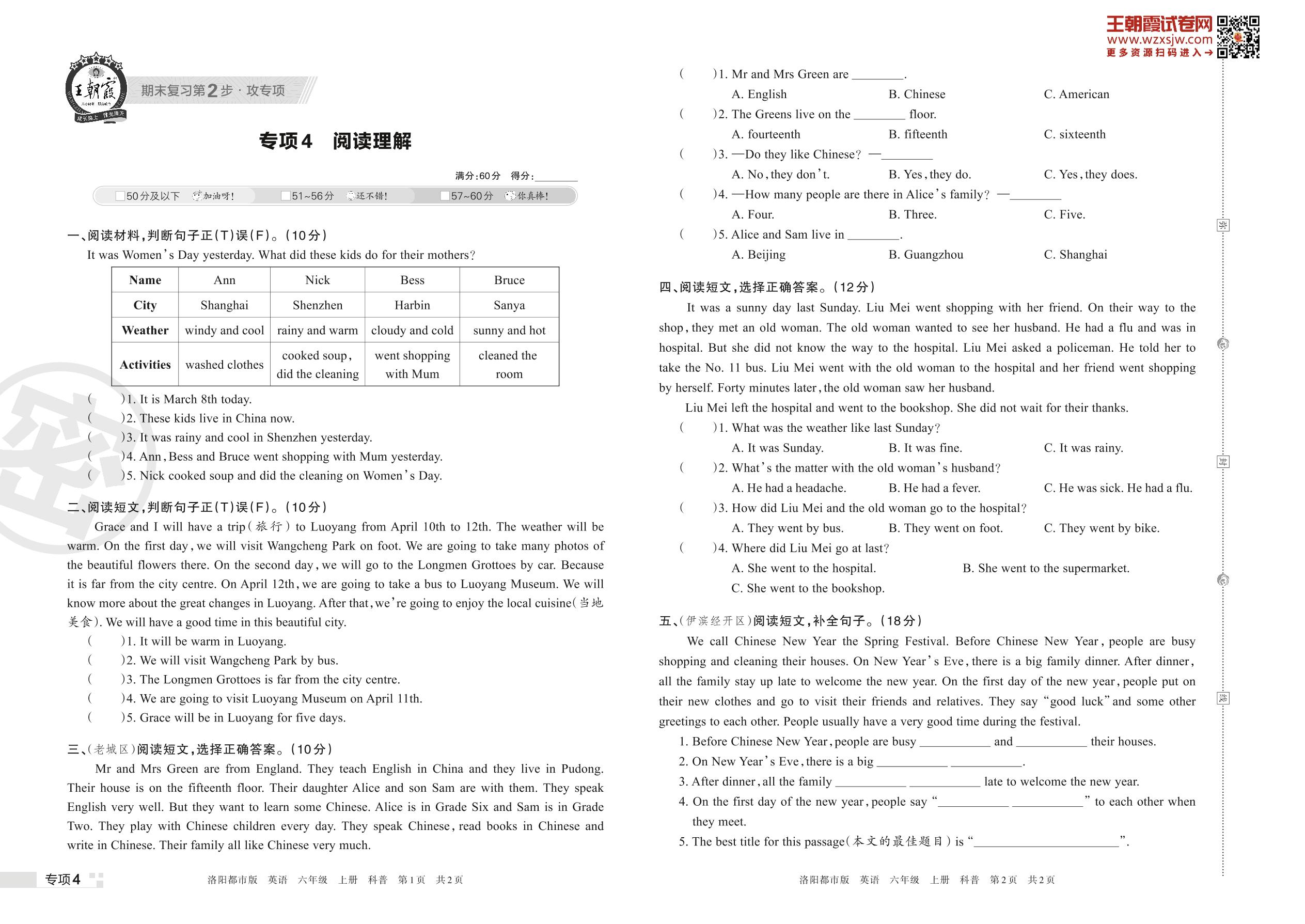 王朝霞期末专项卷——阅读理解六年级上册英语(科普版)【4】