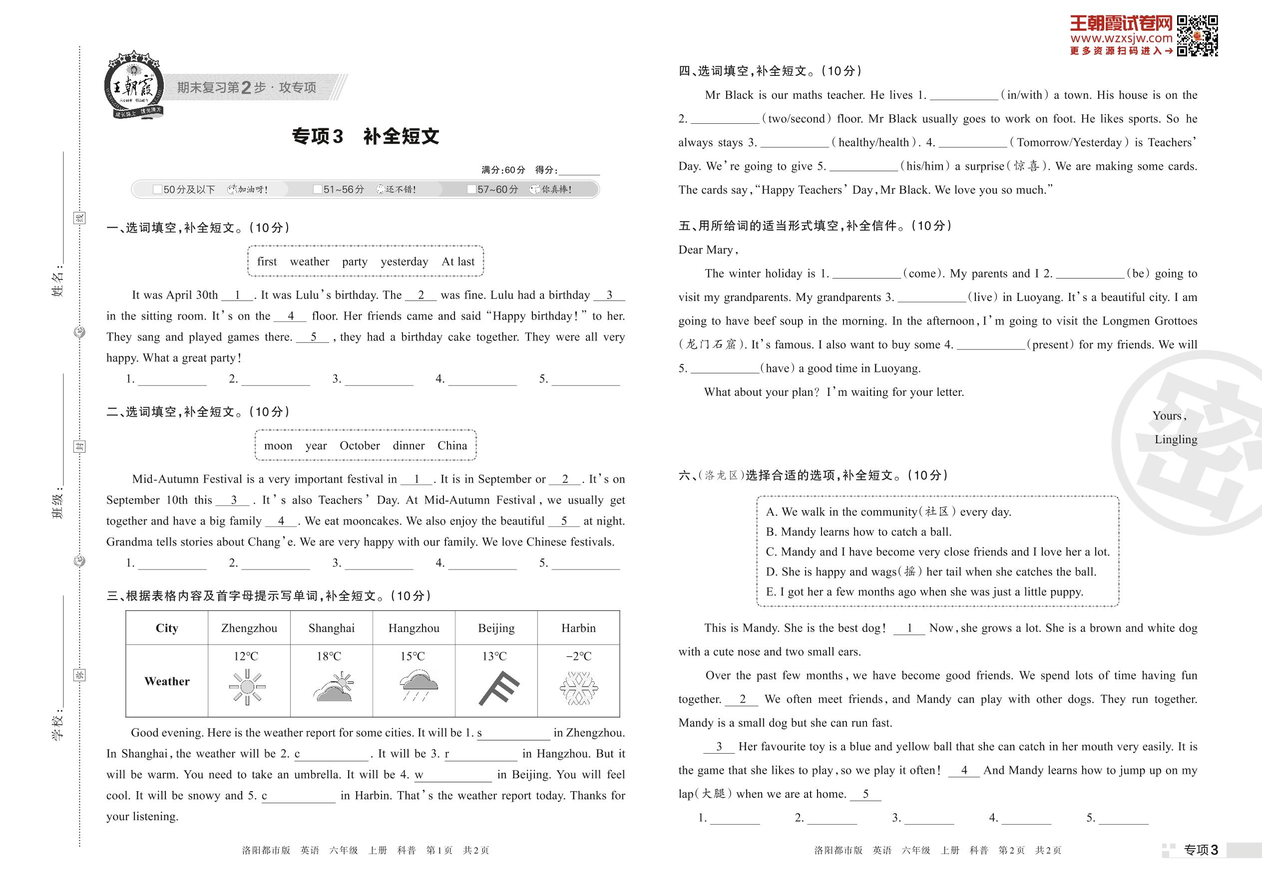 王朝霞期末专项卷——补全短文六年级上册英语(科普版)【3】