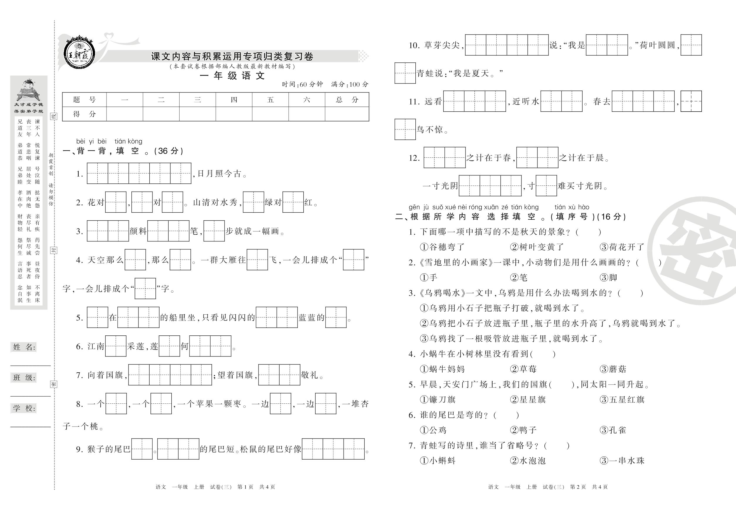 王朝霞期末专项卷一年级上册语文(人教版)_R210731184616【3】