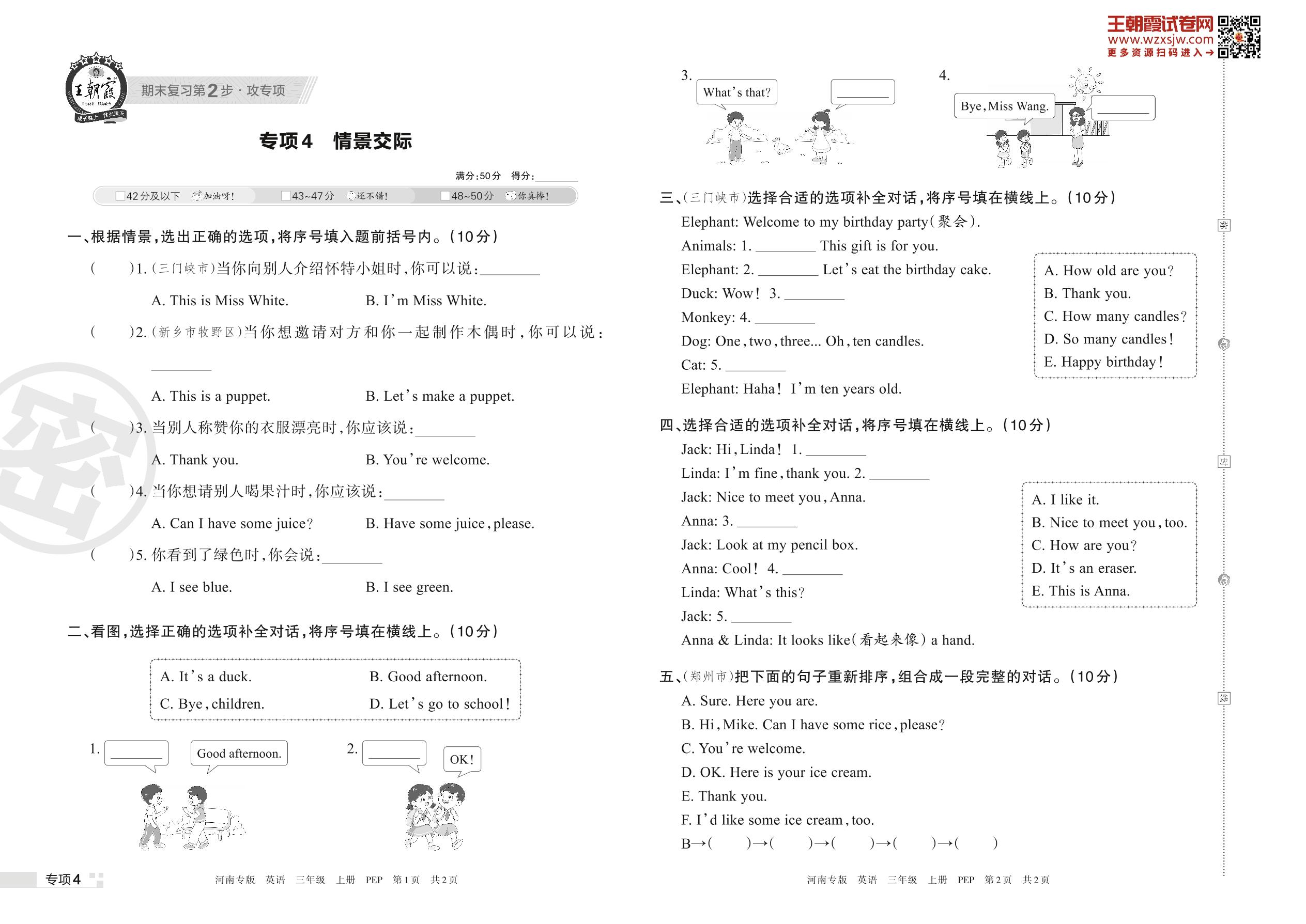 王朝霞期末专项卷——情景交际三年级上册英语(PEP版)【4】
