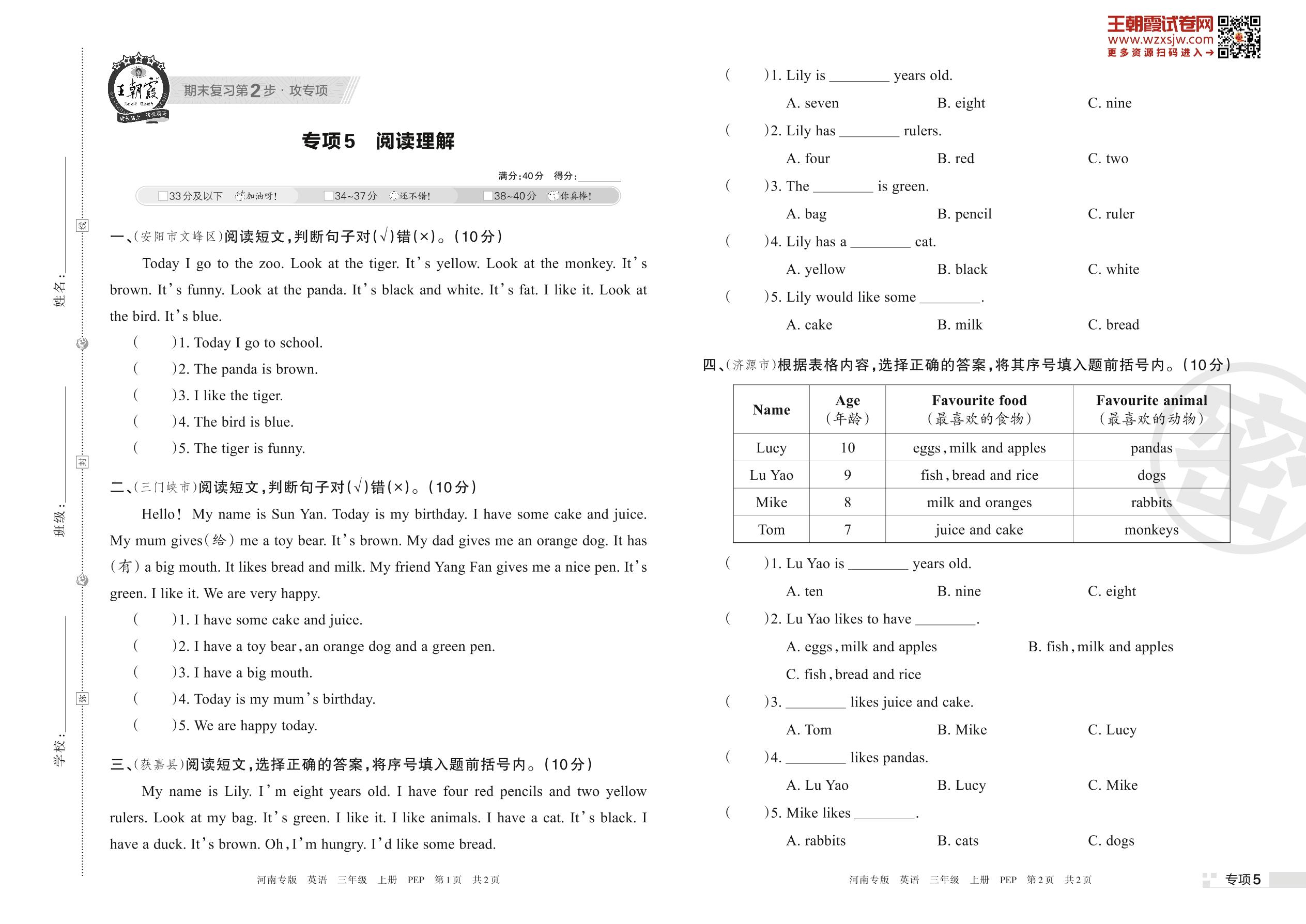 王朝霞期末专项卷——阅读理解三年级上册英语(PEP版)【5】