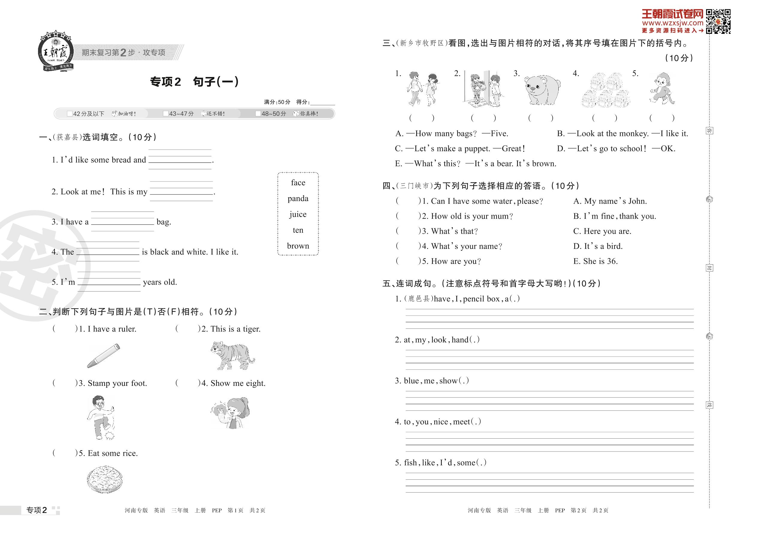 王朝霞期末专项卷——句子(一)三年级上册英语(PEP版)【2】