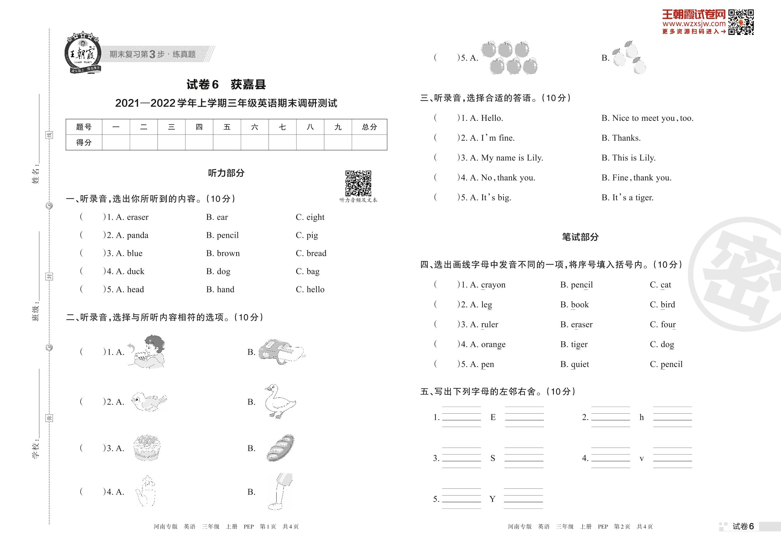 获嘉县2021—2022学年上学期三年级英语期末调研测试(PEP版)【6】