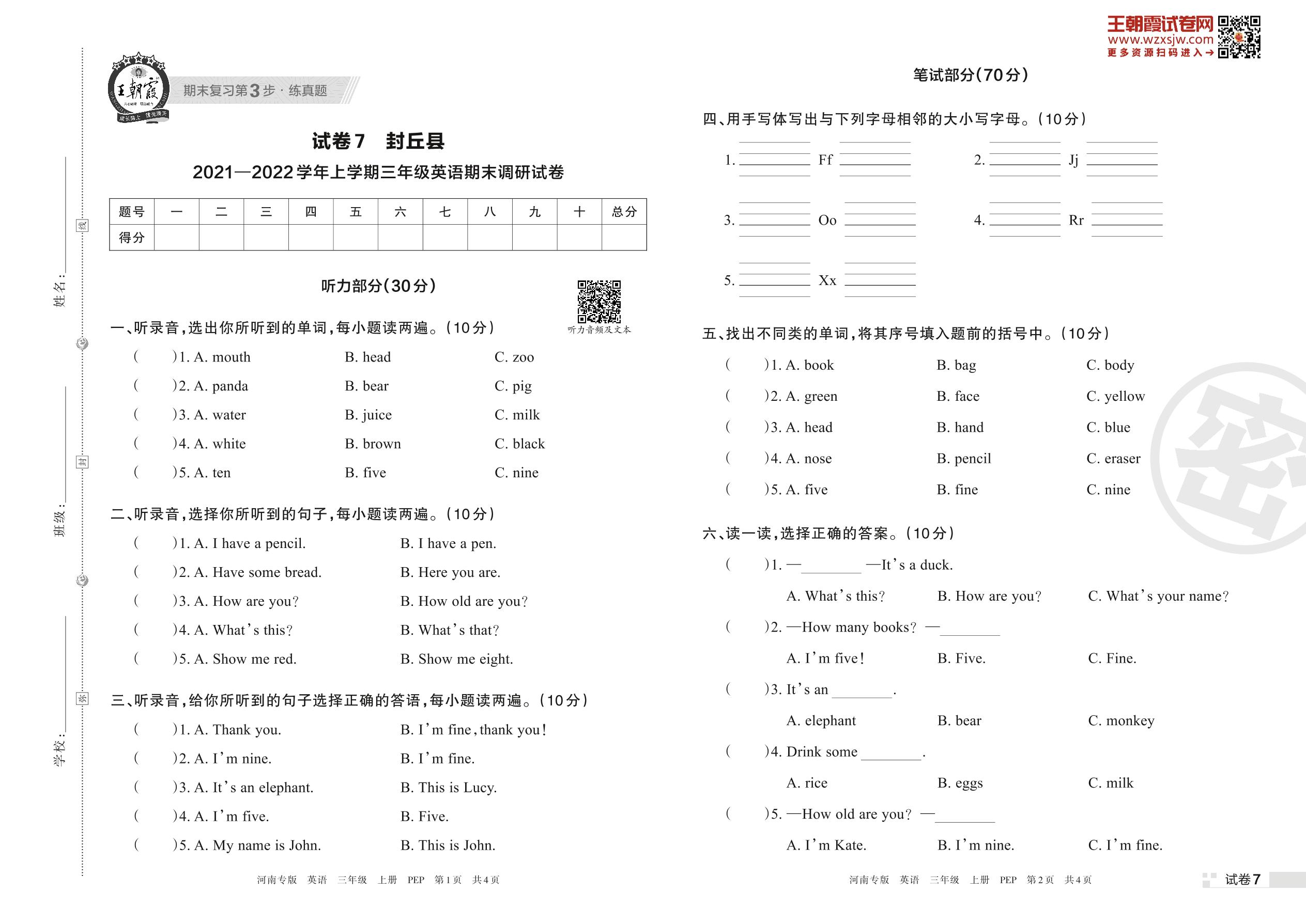 封丘县2021—2022学年上学期三年级英语期末调研试卷(PEP版)【7】