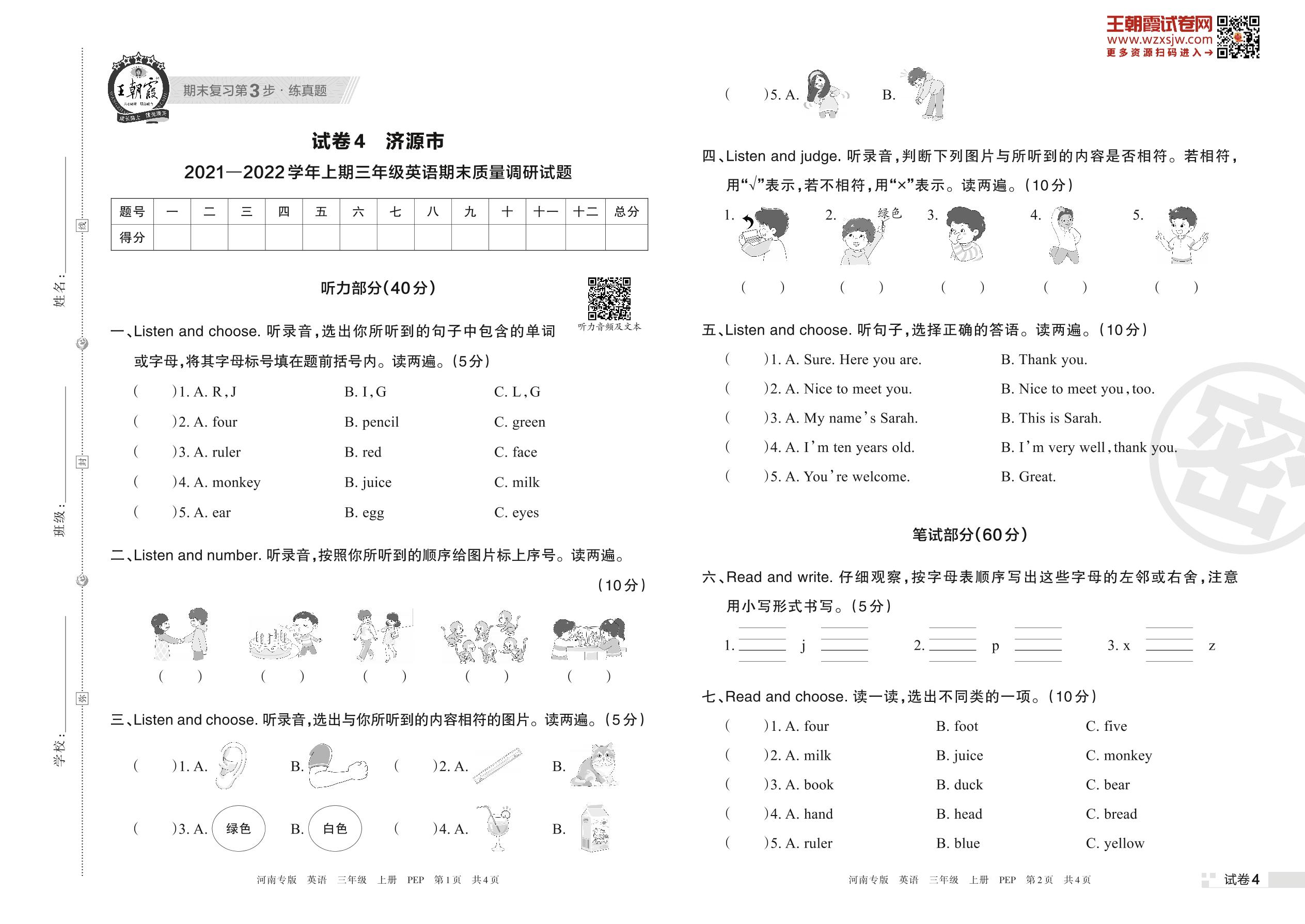 济源市2021—2022学年上期三年级英语期末质量调研试题(PEP版)【4】