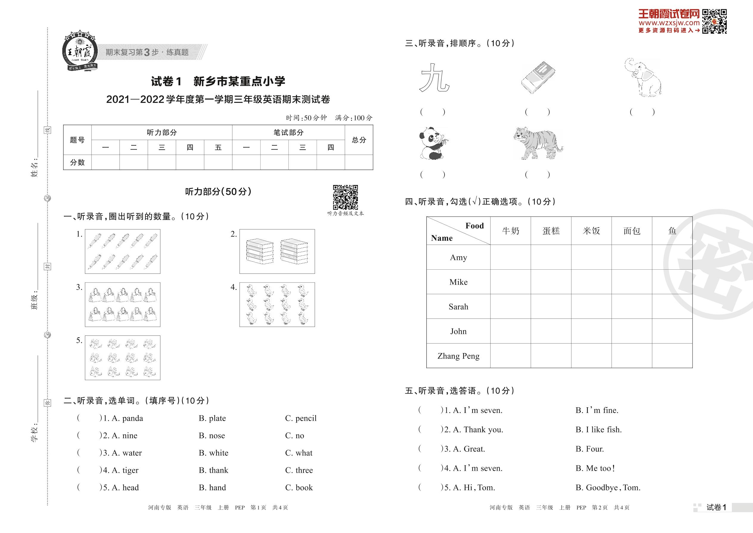 新乡市某重点小学2021—2022学年度第一学期三年级英语期末测试卷(PEP版)【1】