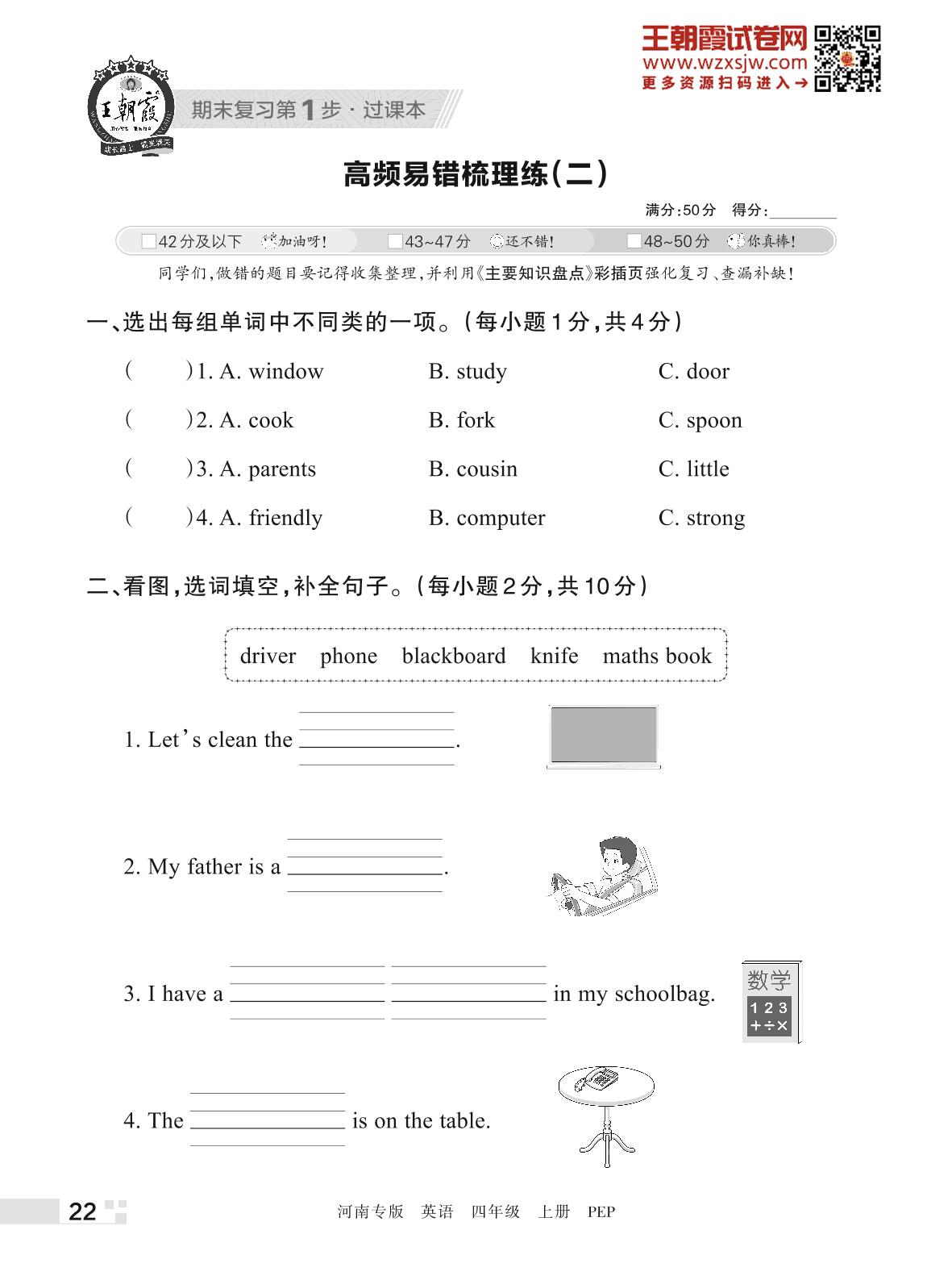 王朝霞期末过课本——高频易错梳理练(二)四年级上册英语(PEP版)