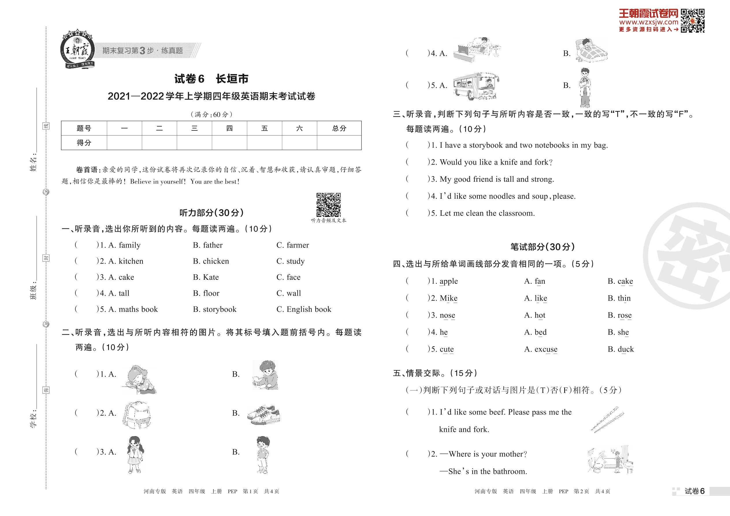 长垣市2021—2022学年上学期四年级英语期末考试试卷(PEP版)【6】
