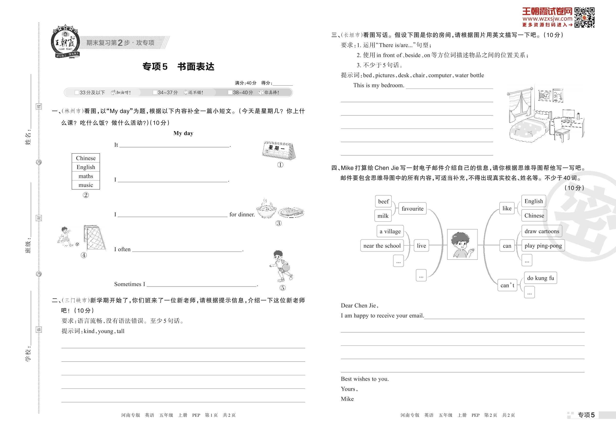王朝霞期末专项卷——书面表达五年级上册英语(PEP版)【5】