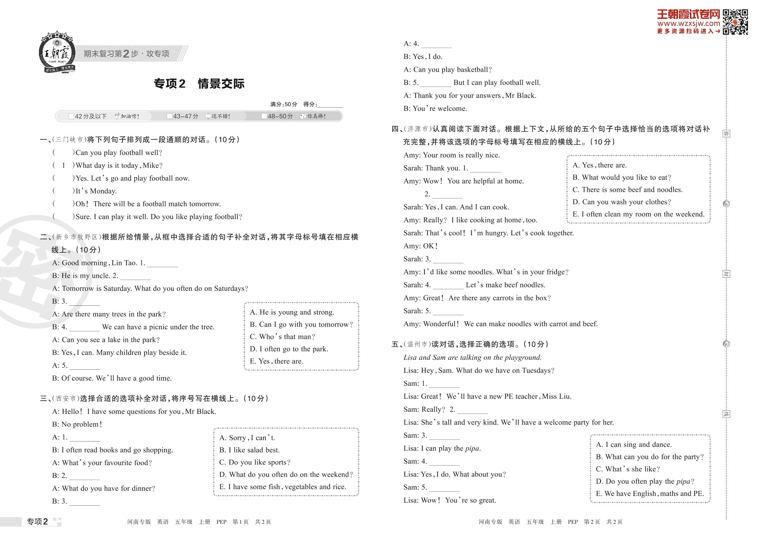 王朝霞期末专项卷——情景交际五年级上册英语(PEP版)【2】
