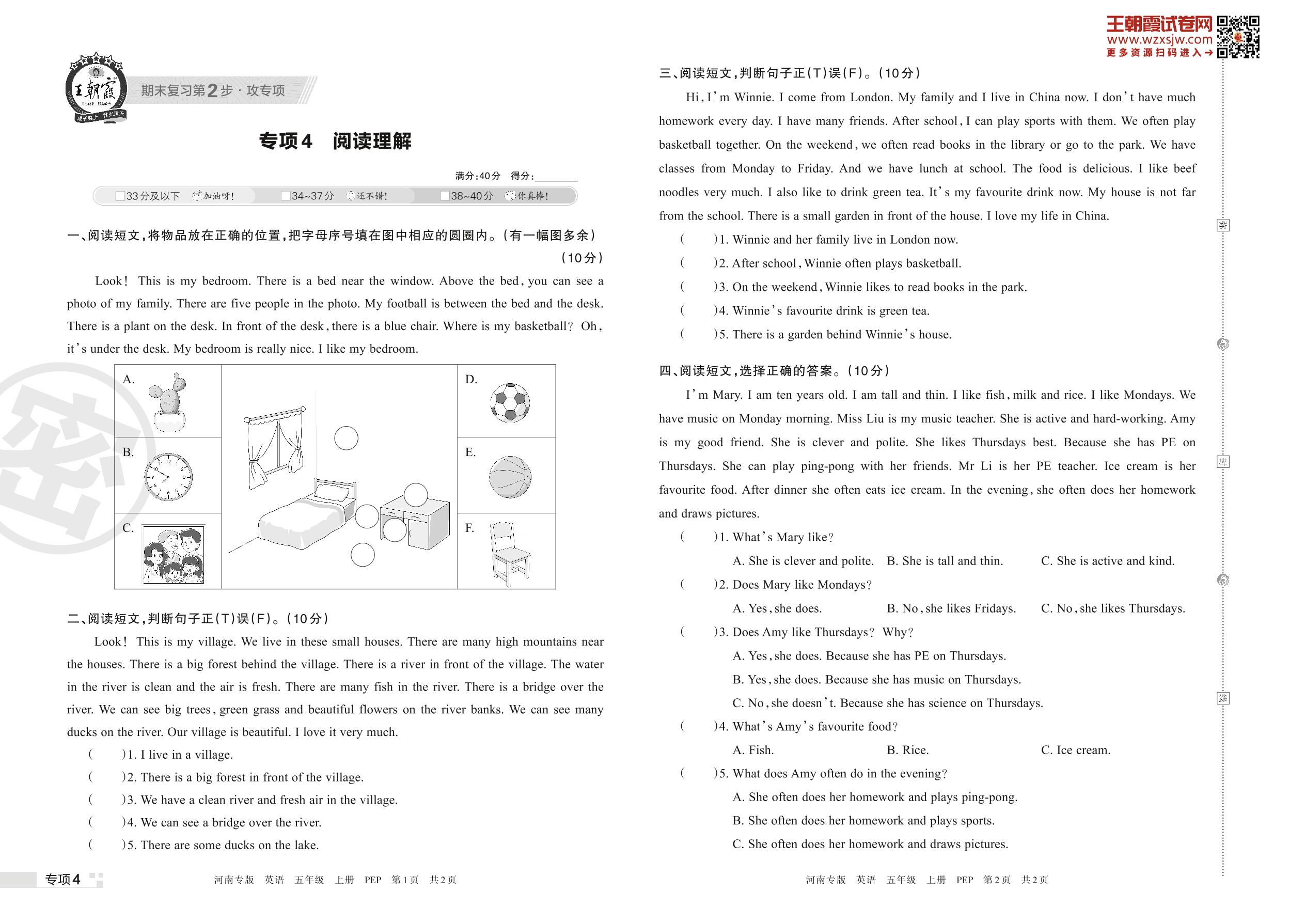 王朝霞期末专项卷——阅读理解五年级上册英语(PEP版)【4】