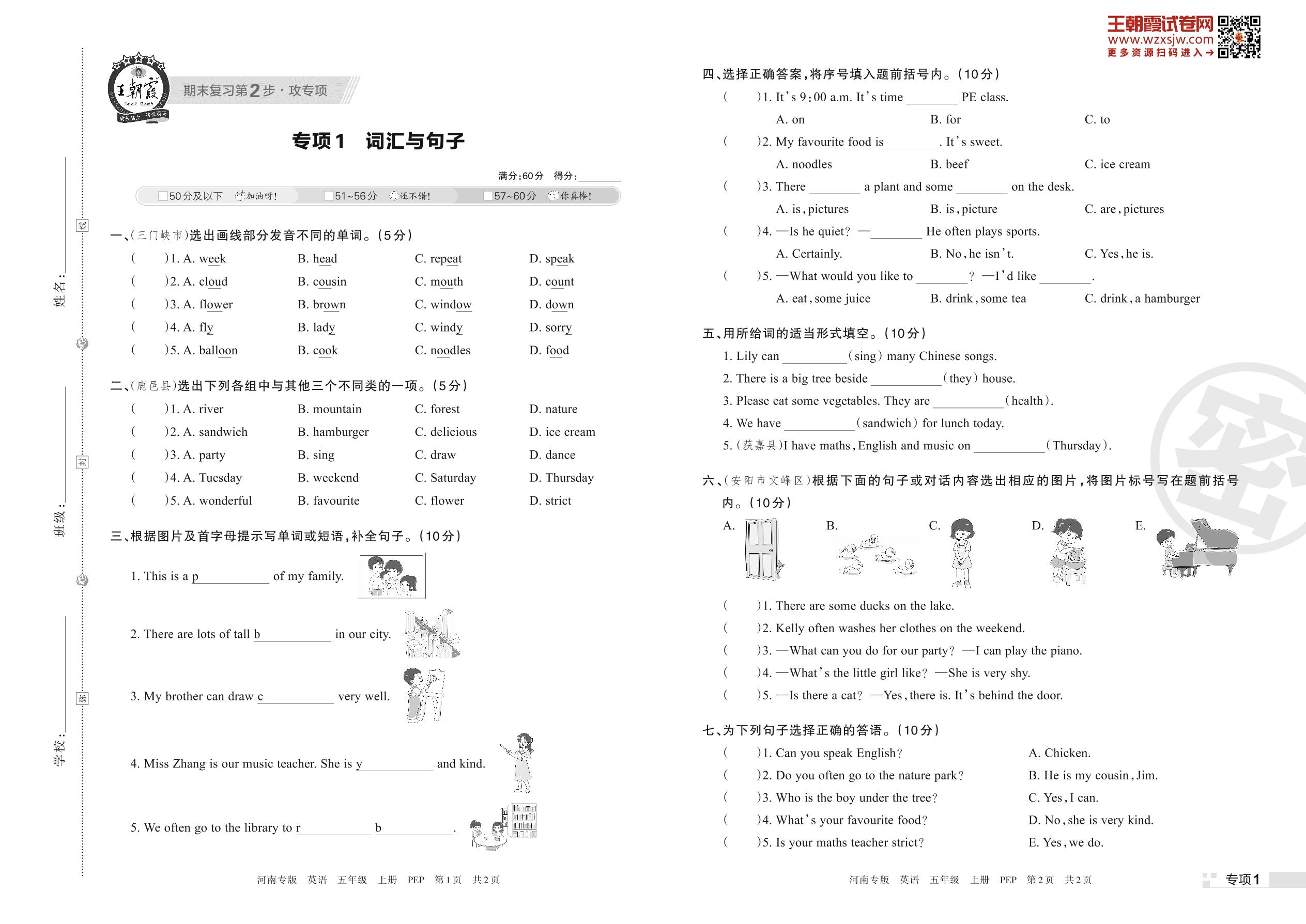 王朝霞期末专项卷——词汇与句子五年级上册英语(PEP版)【1】
