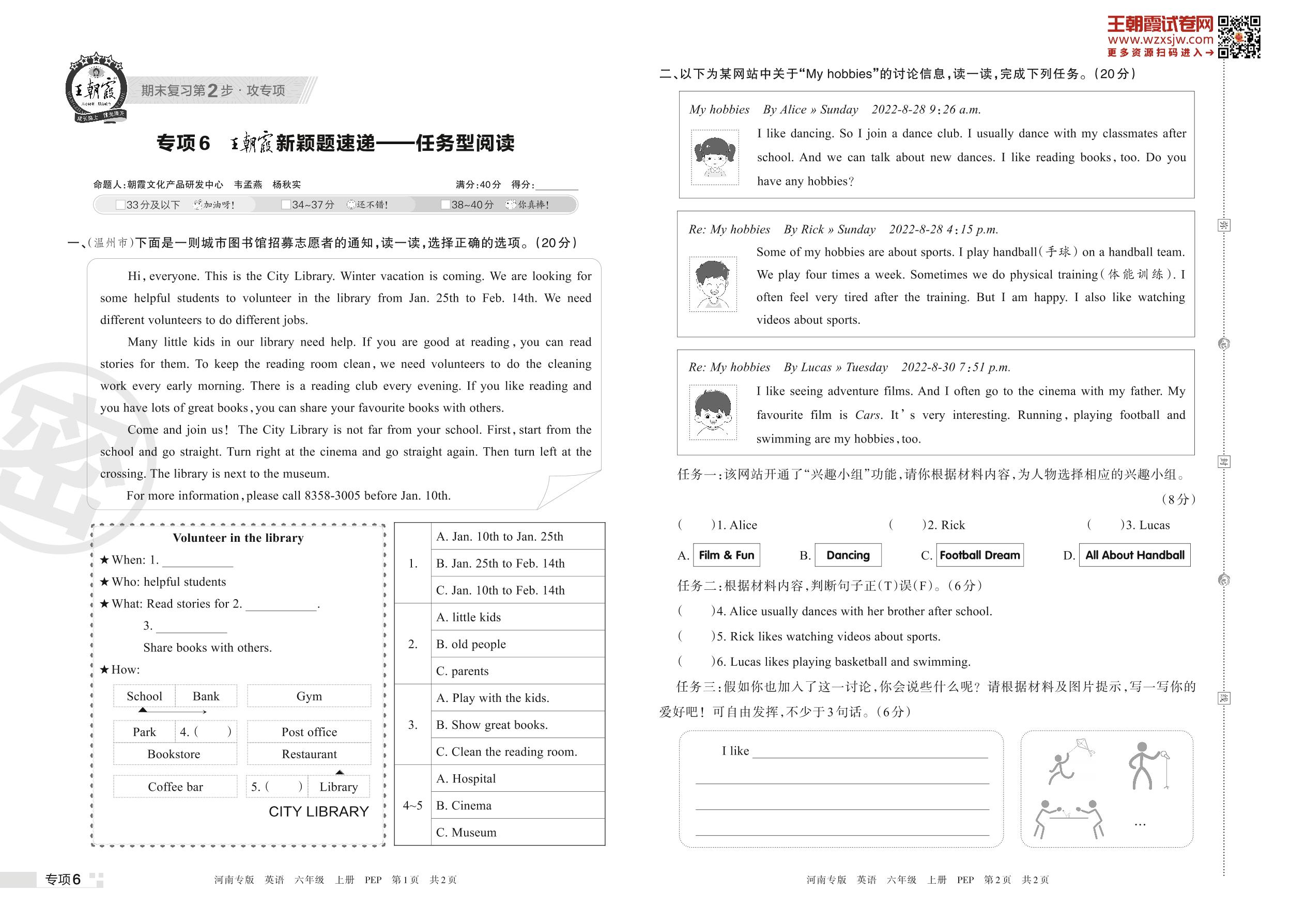 王朝霞期末专项卷——王朝霞新颖题速递:任务型阅读六年级上册英语(PEP版)【6】