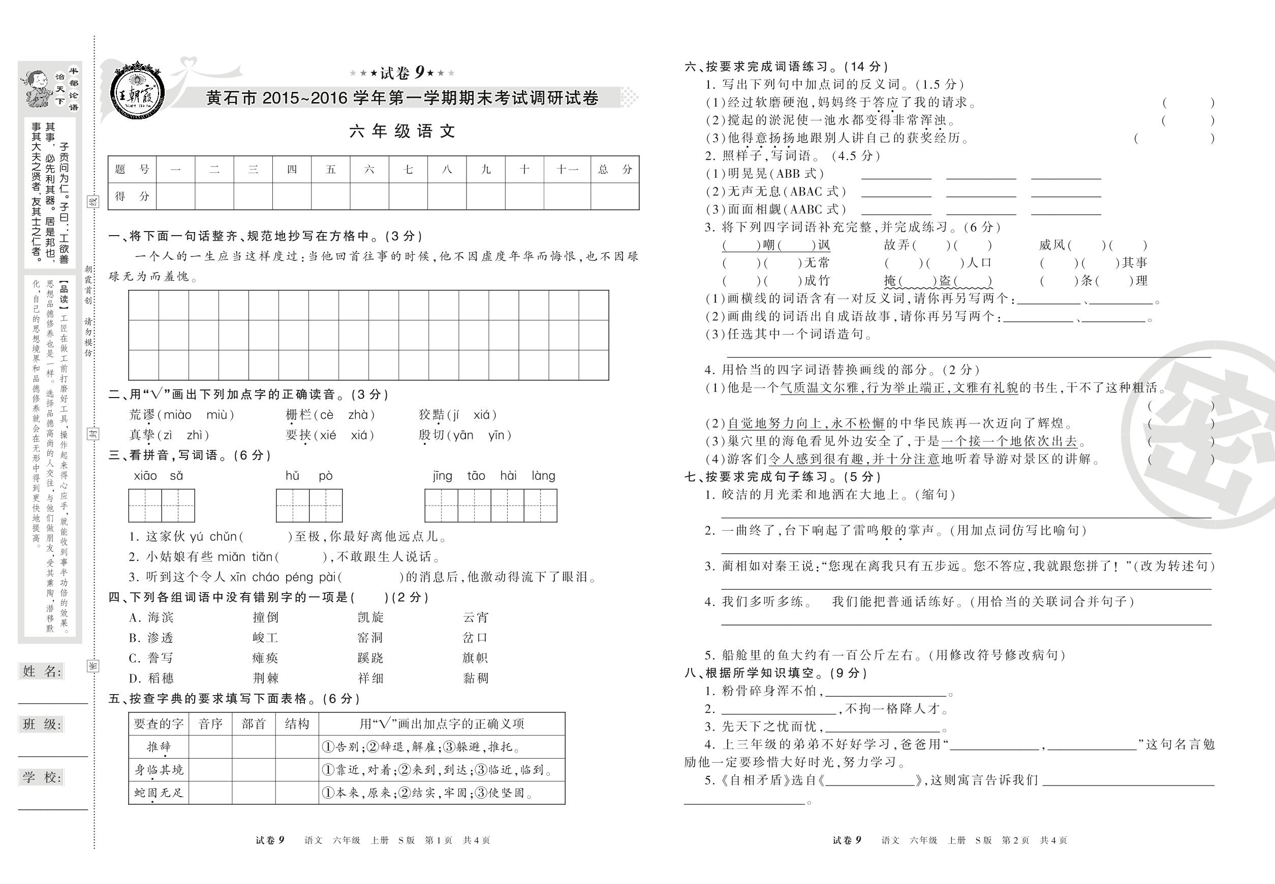 2015-2016学年第一学期黄石市六年级语文试卷(S版)【9】