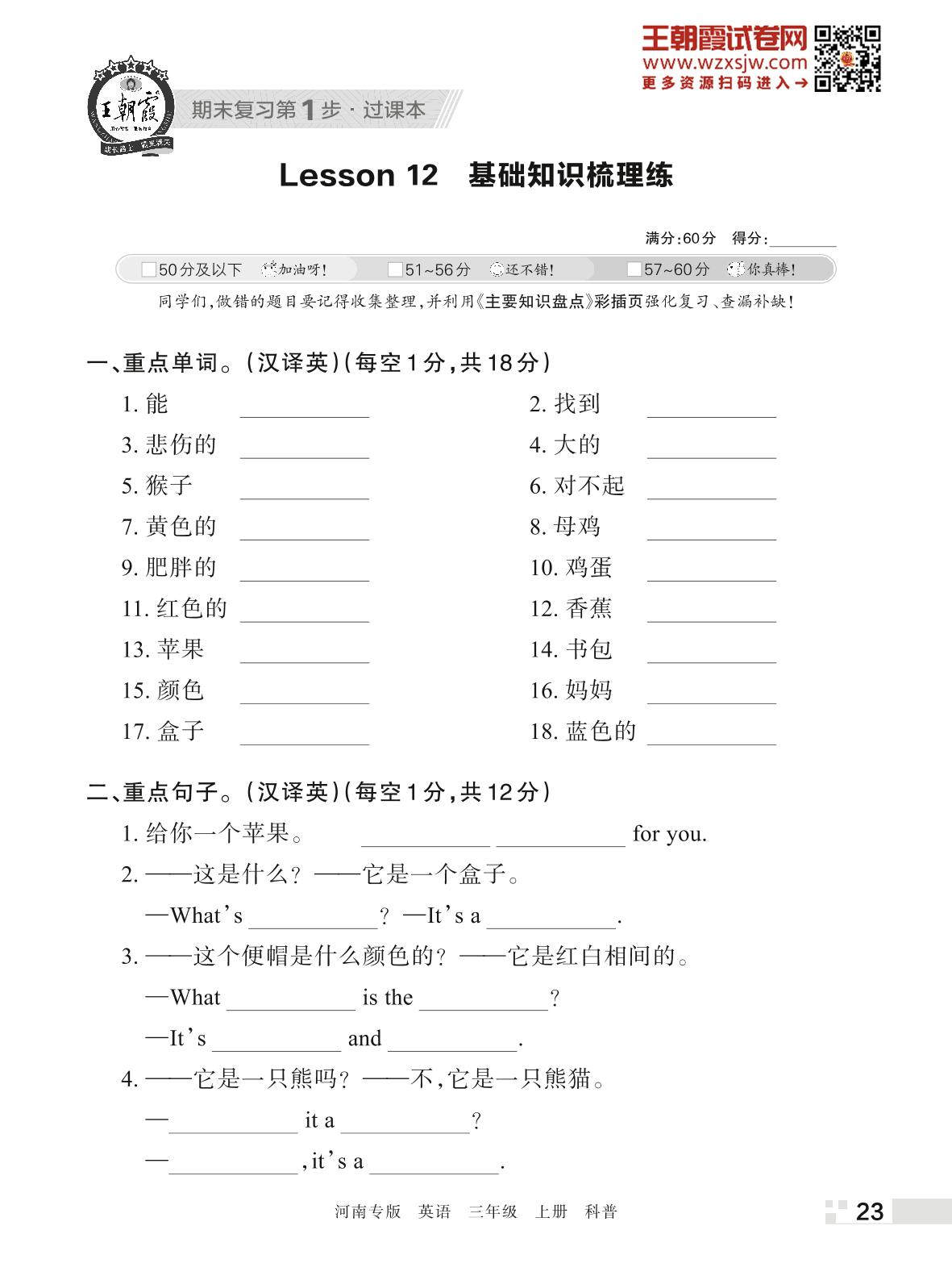 王朝霞期末过课本——Lesson 12 基础知识梳理练三年级上册英语(科普版)_R221111142826157