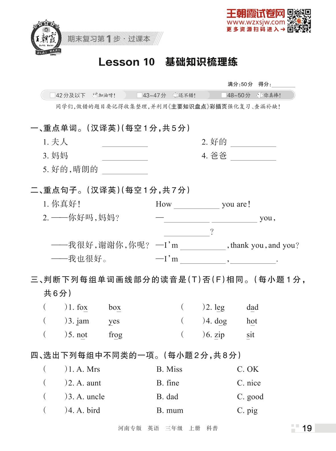 王朝霞期末过课本——Lesson 10 基础知识梳理练三年级上册英语(科普版)_R221111142826503