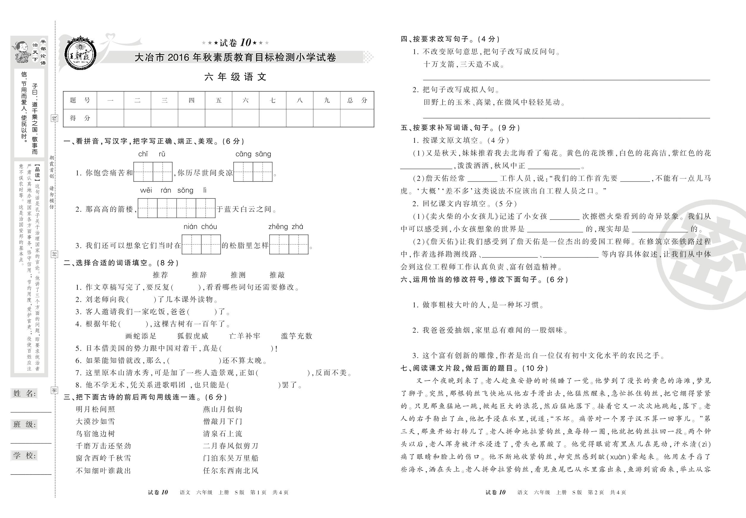 2016-2017学年第一学期大冶市六年级语文试卷(S版)【10】