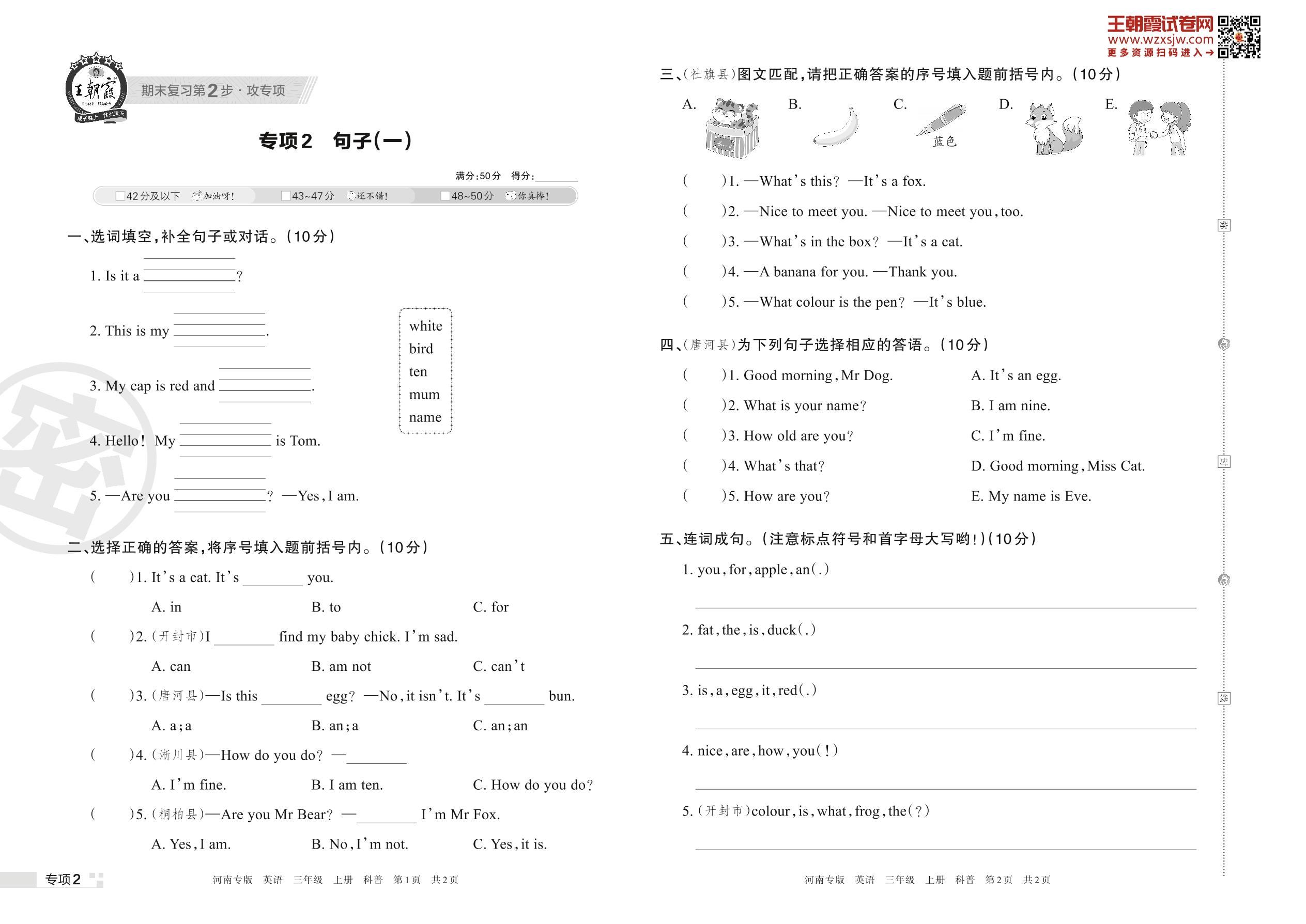 王朝霞期末专项卷——句子(一)三年级上册英语(科普版)_R221111142827421【2】
