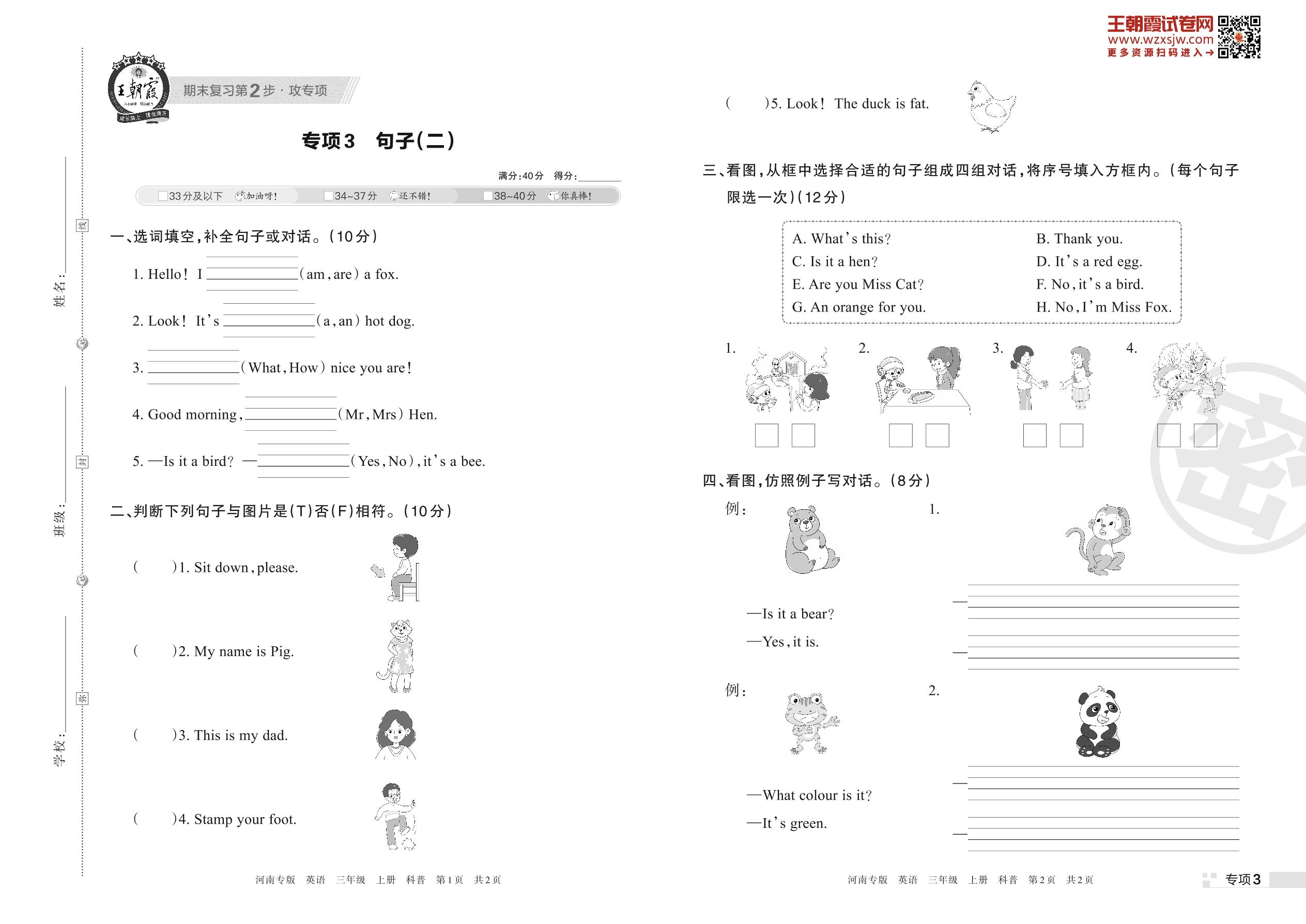 王朝霞期末专项卷——句子(二)三年级上册英语(科普版)_R221111142827271【3】