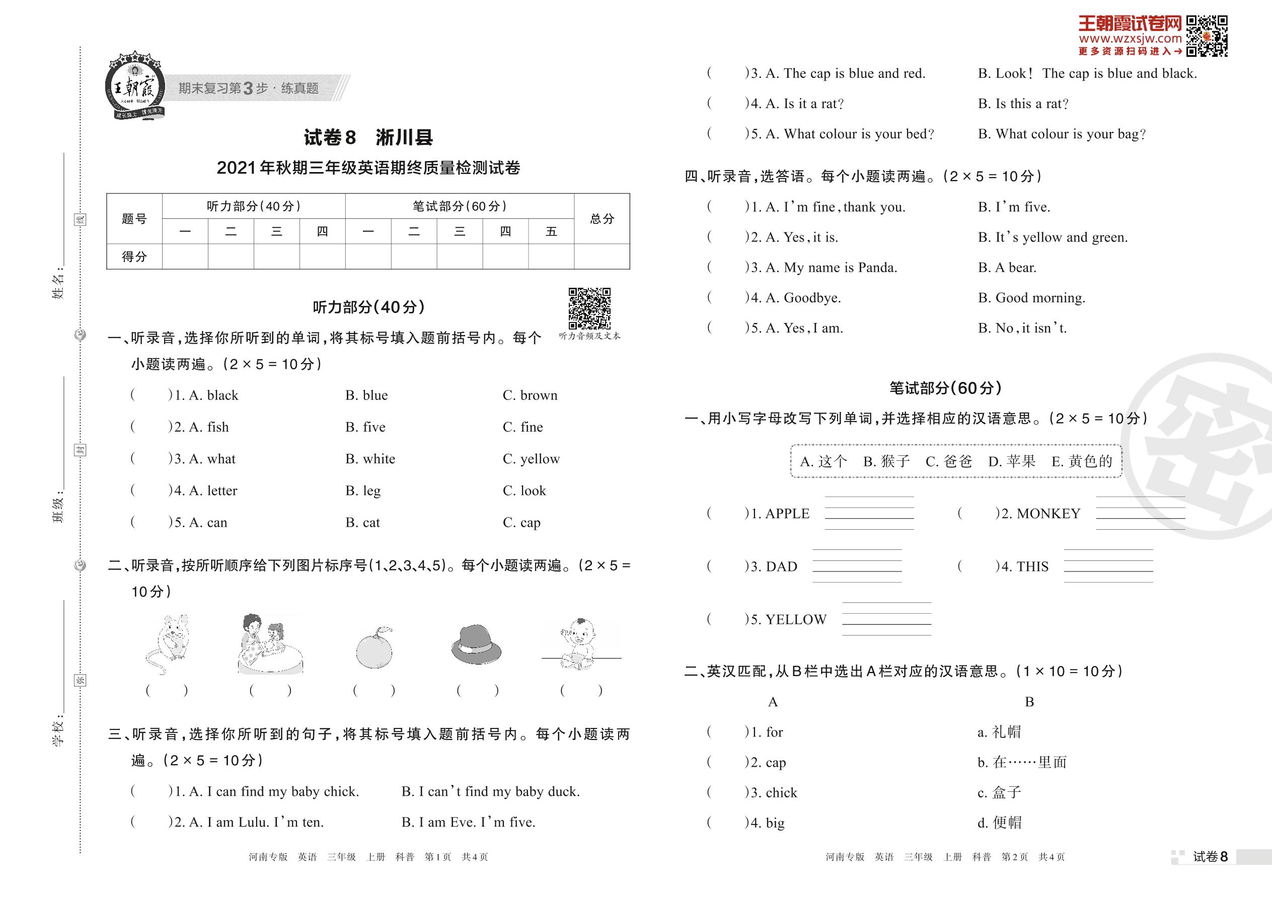 淅川县2021年秋期三年级英语期终质量检测试卷(科普版)【8】