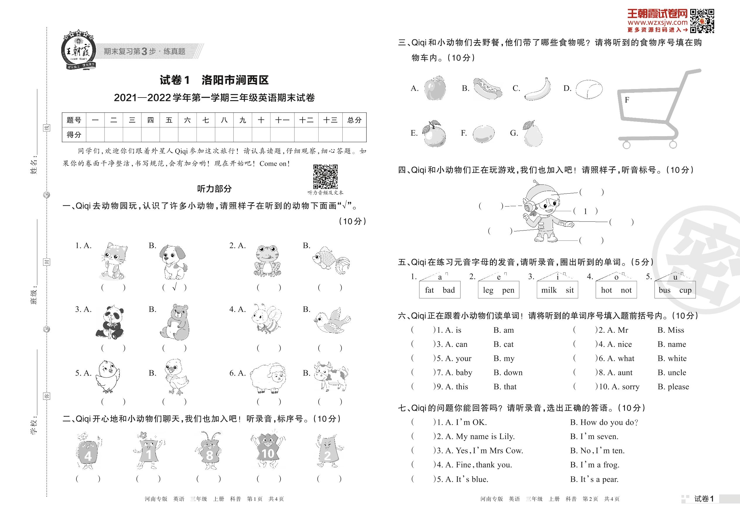 洛阳市涧西区2021—2022学年第一学期三年级英语期末试卷(科普版)【1】