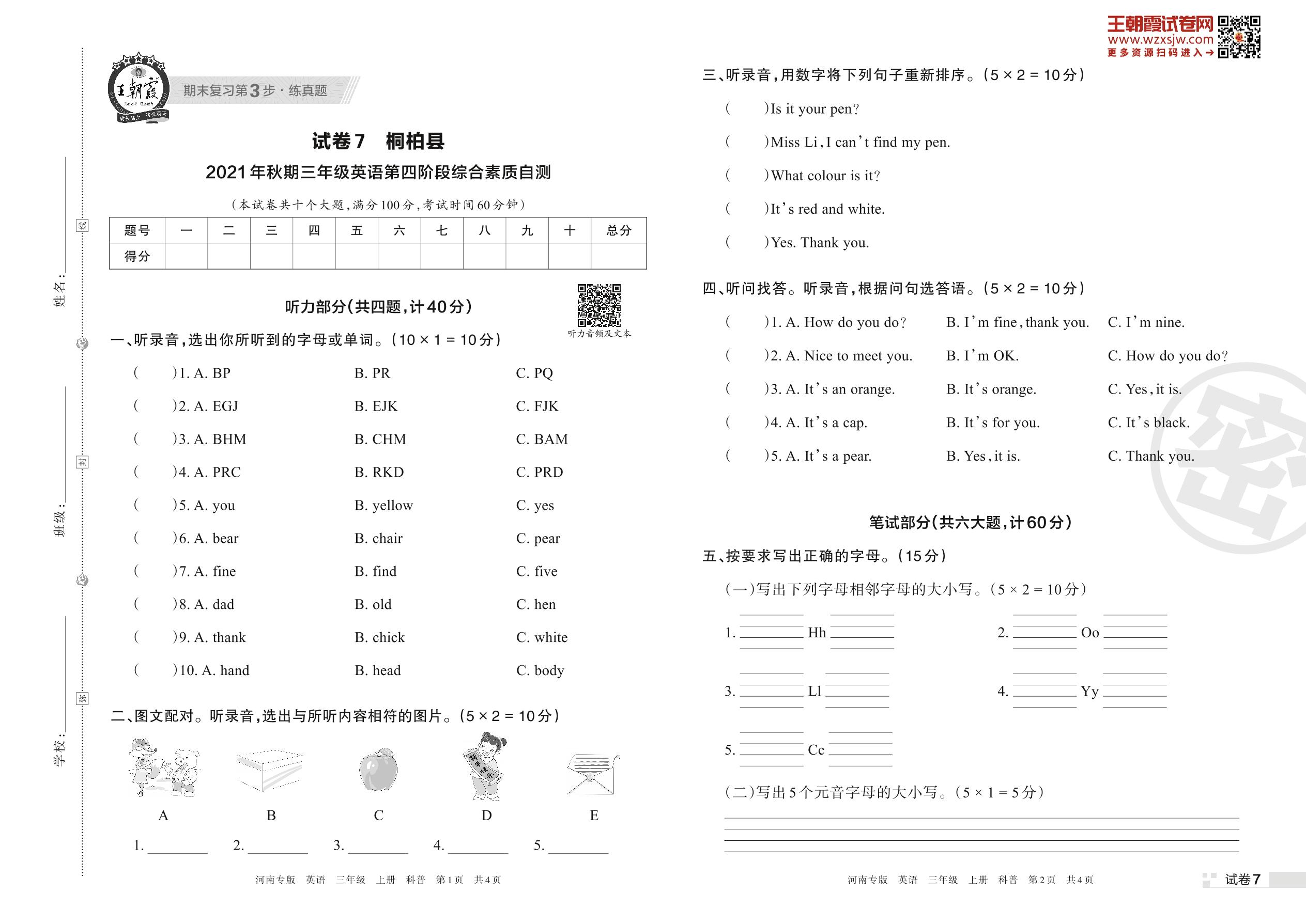 三年级英语科普版上册期末卷