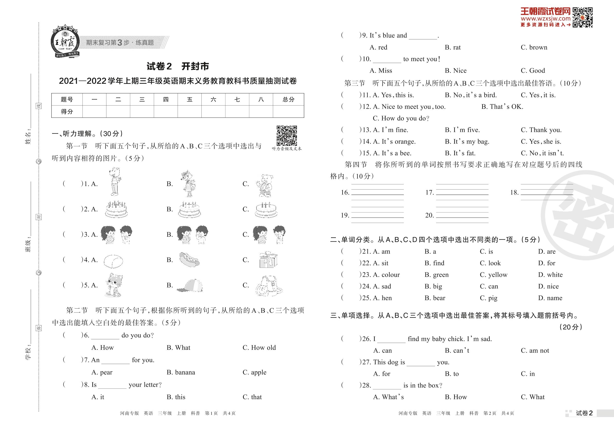 开封市2021—2022学年上期三年级英语期末义务教育教科书质量抽测试卷(科普版)【2】