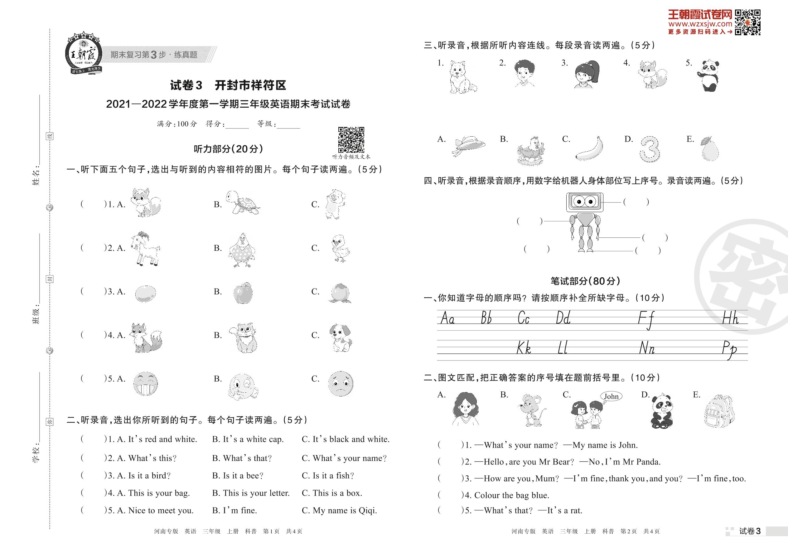 开封市祥符区2021—2022学年度第一学期三年级英语期末考试试卷(科普版)【3】