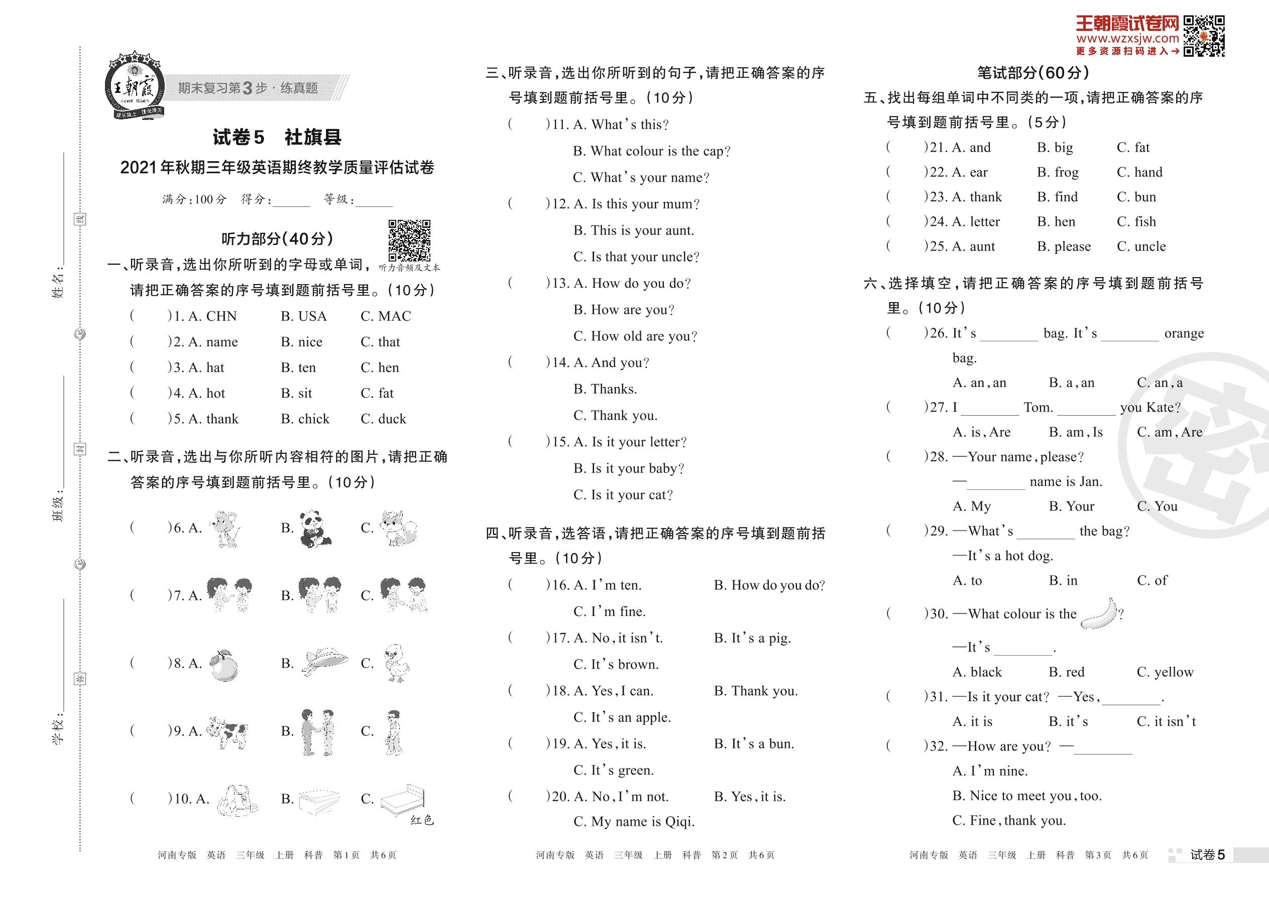 社旗县2021年秋期三年级英语期终教学质量评估试卷(科普版)【5】