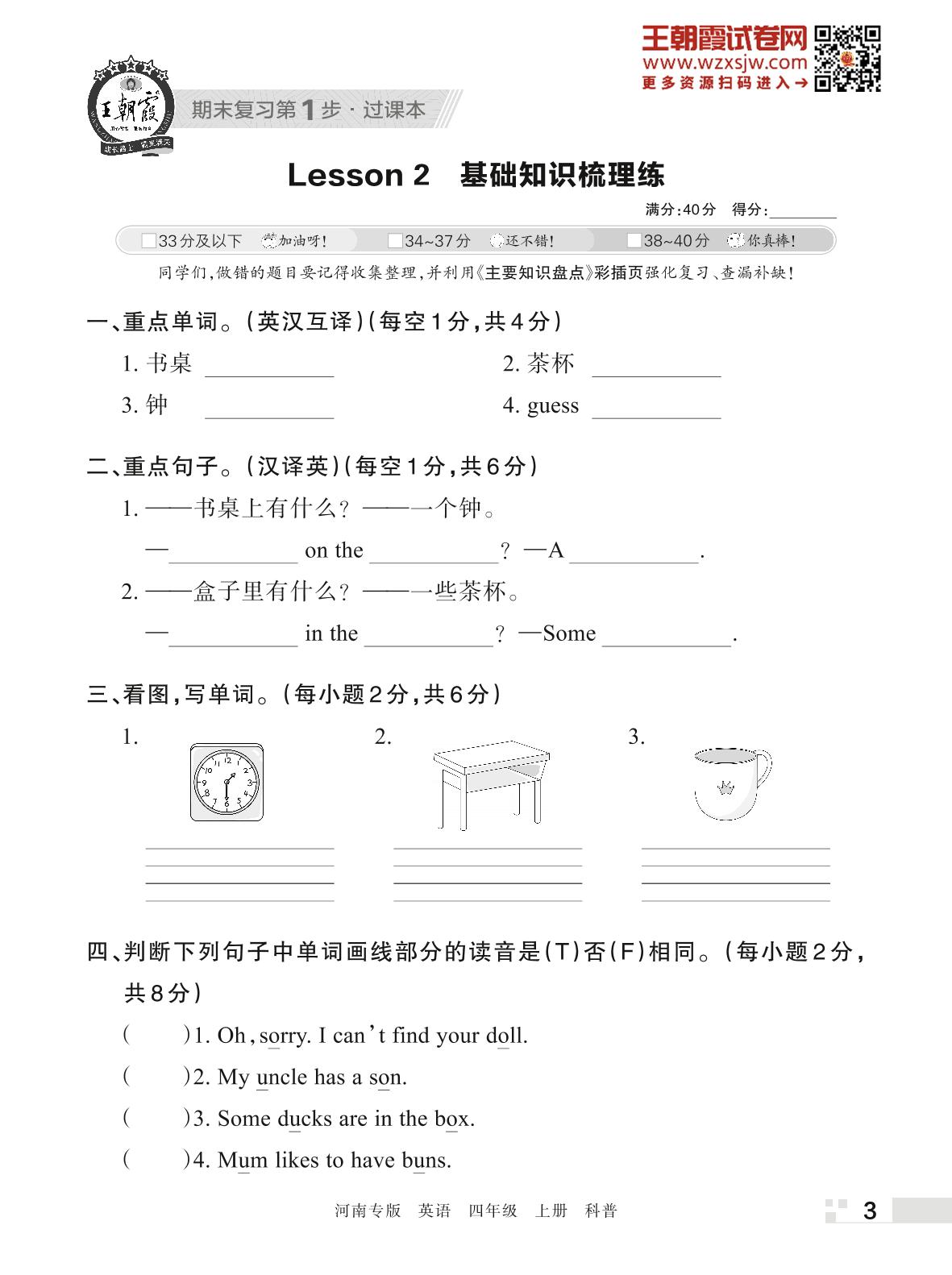 王朝霞期末过课本——Lesson 2 基础知识梳理练四年级上册英语(科普版)_R221111143652823