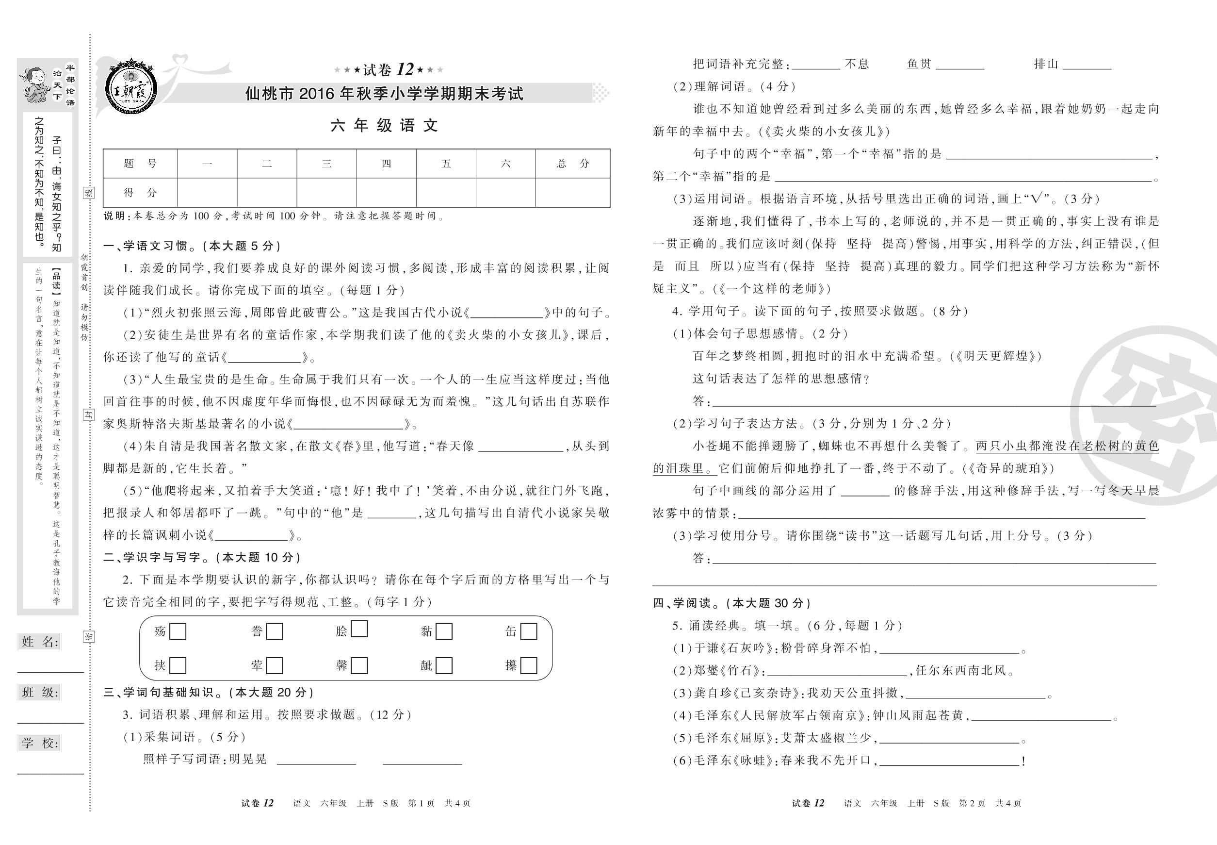 2016-2017学年第一学期仙桃市六年级语文试卷(S版)【12】