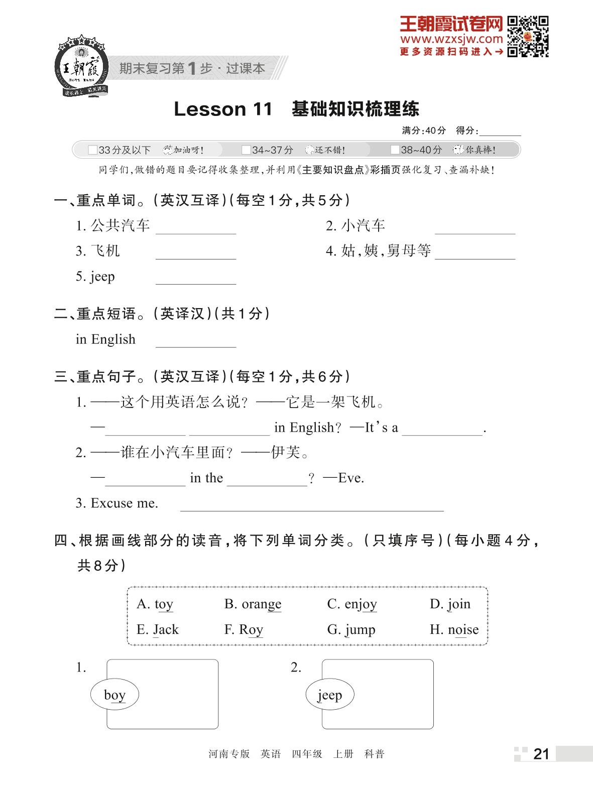 王朝霞期末过课本——Lesson 11 基础知识梳理练四年级上册英语(科普版)_R221111143652200