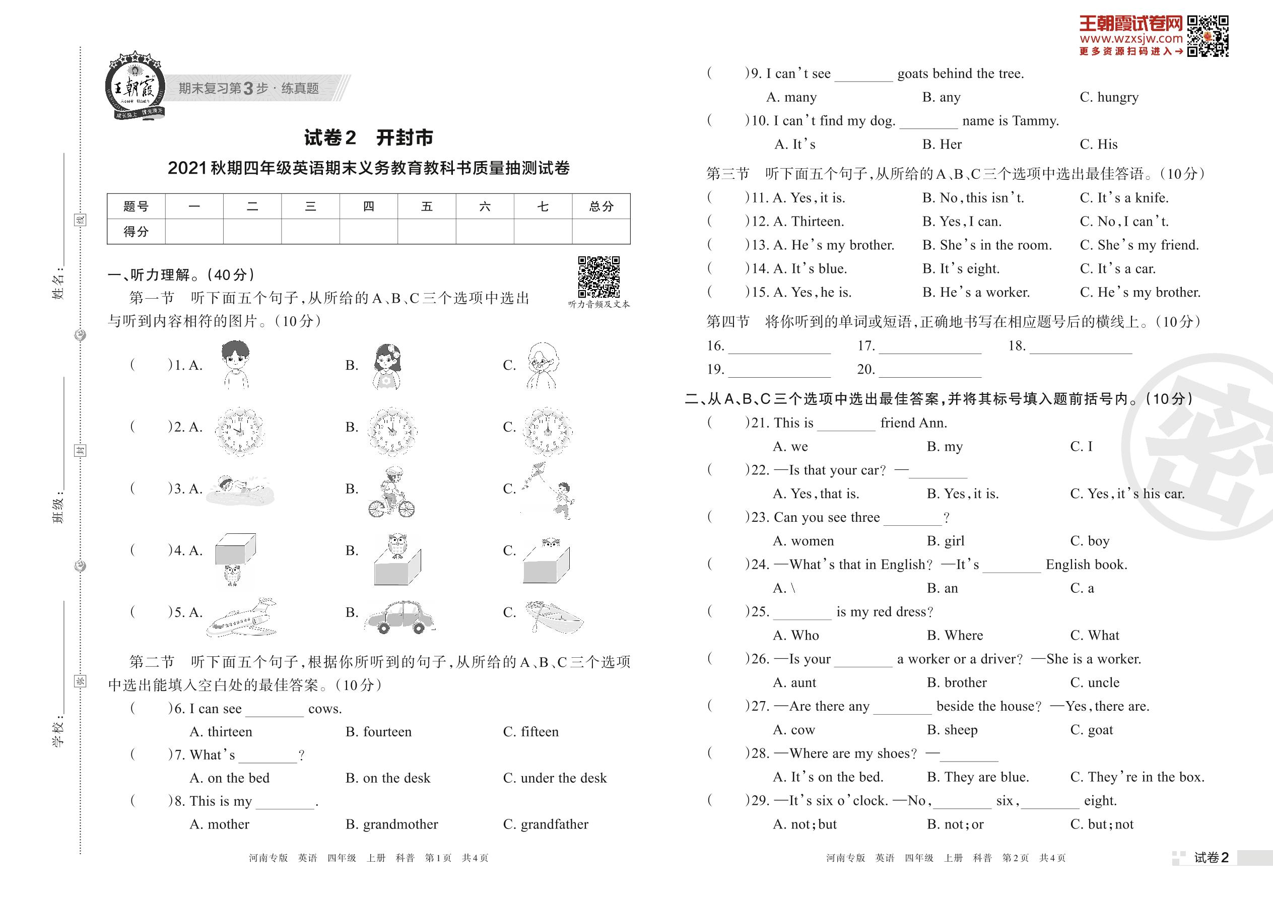 开封市2021秋期四年级英语期末义务教育教科书质量抽测试卷(科普版)【2】
