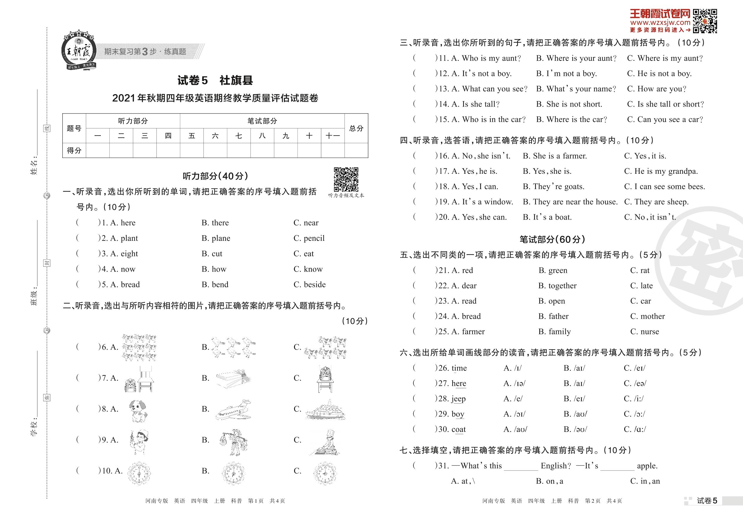 社旗县2021年秋期四年级英语期终教学质量评估试题卷(科普版)【5】