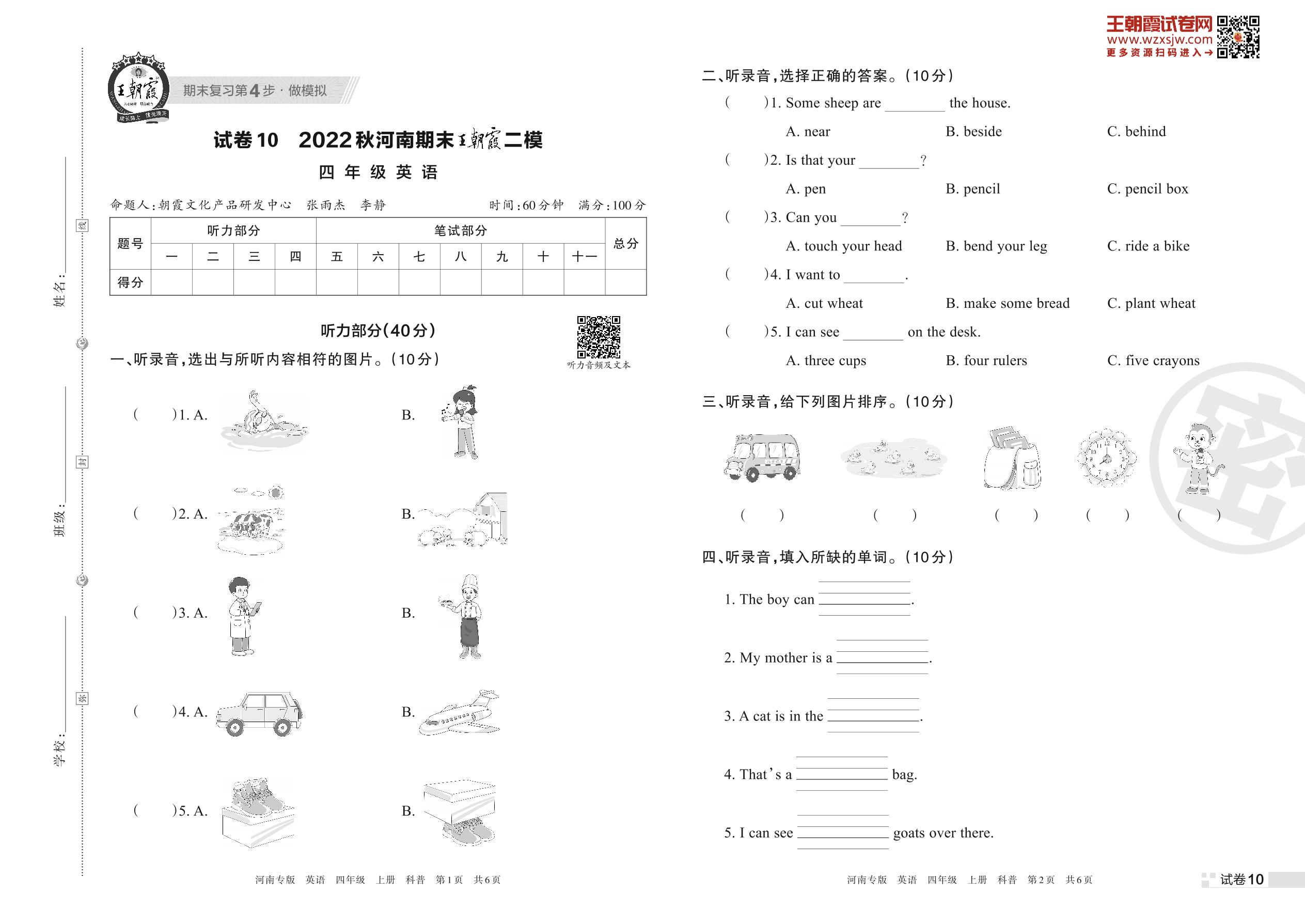 王朝霞期末模拟卷四年级上册英语(科普版)_R221111143655292【10】