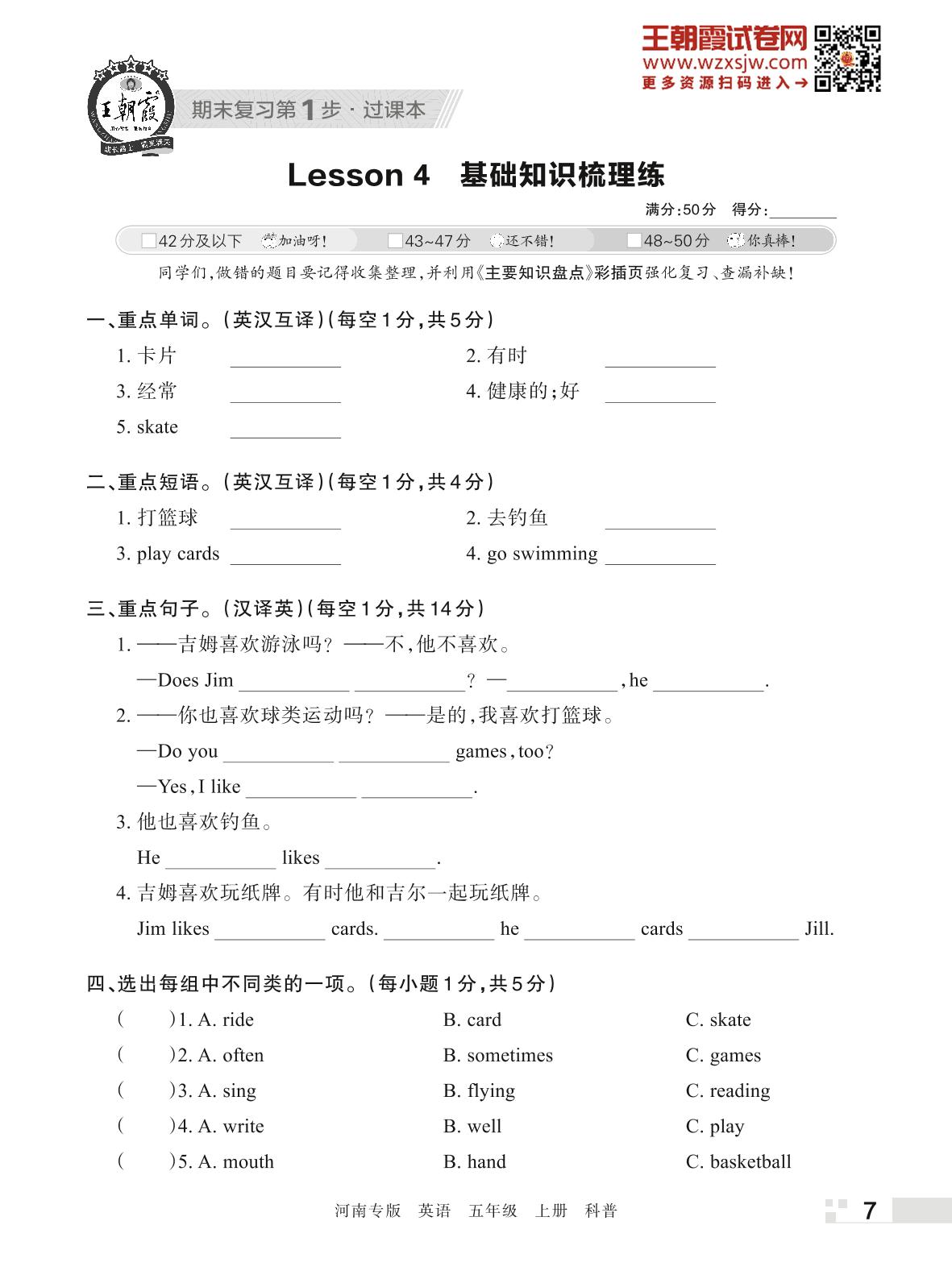 王朝霞期末过课本——Lesson 4 基础知识梳理练五年级上册英语(科普版)_R221111144524680