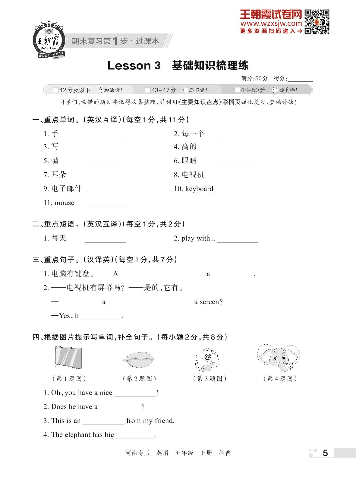 王朝霞期末过课本——Lesson 3 基础知识梳理练五年级上册英语(科普版)_R221111144524588