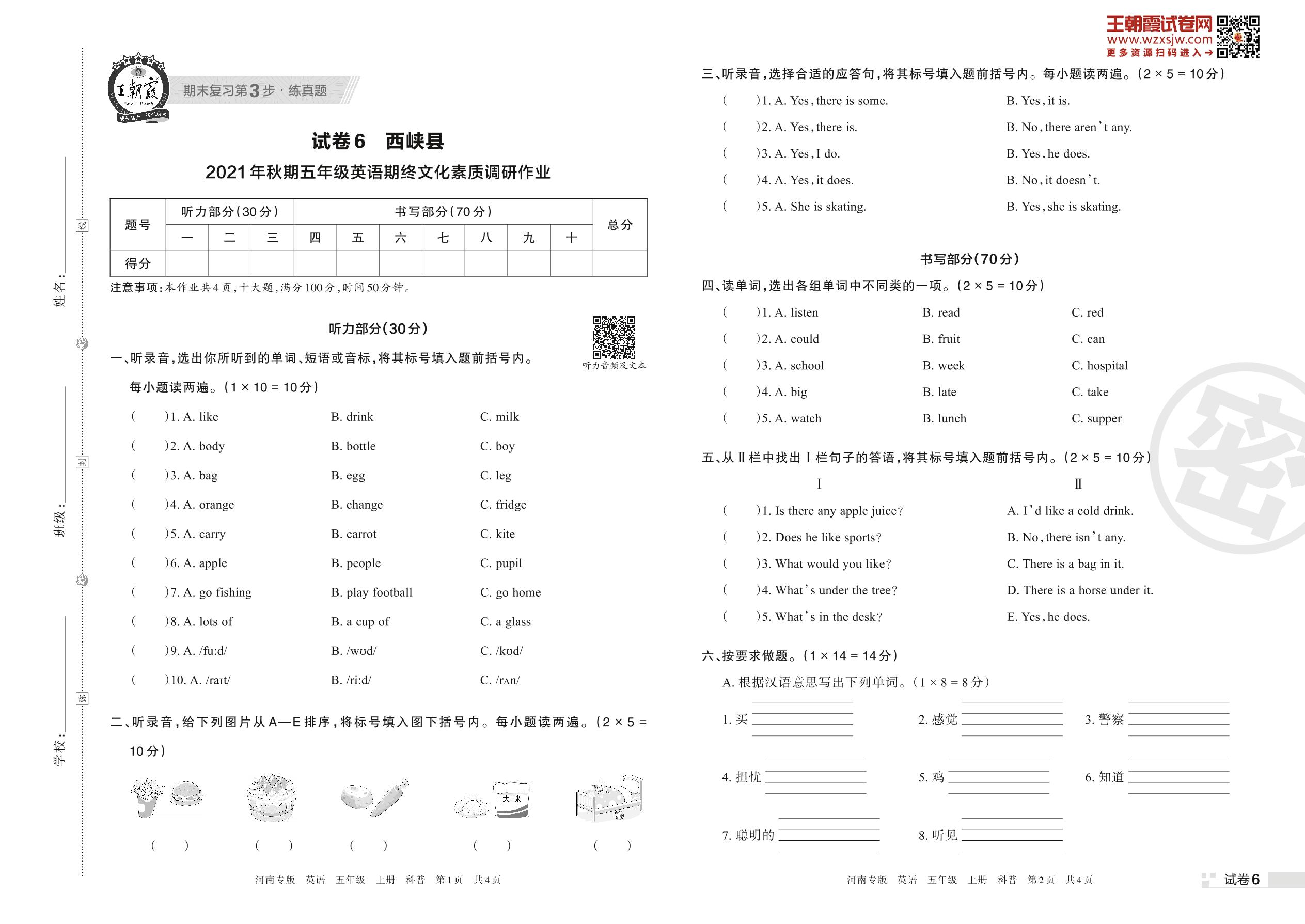 西峡县2021年秋期五年级英语期终文化素质调研作业(科普版)【6】