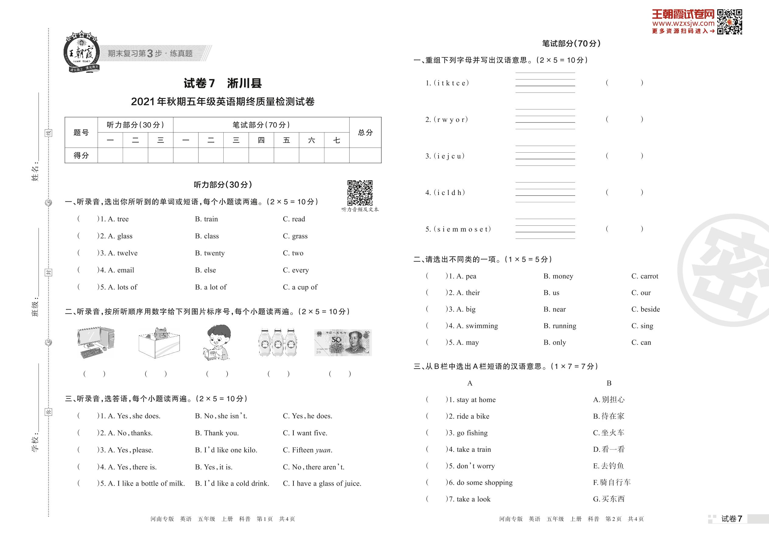 淅川县2021年秋期五年级英语期终质量检测试卷(科普版)【7】