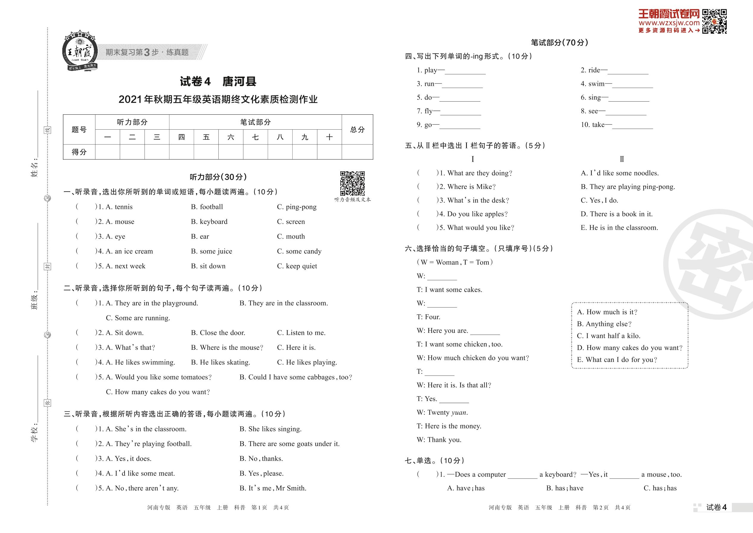 唐河县2021年秋期五年级英语期终文化素质检测作业(科普版)【4】