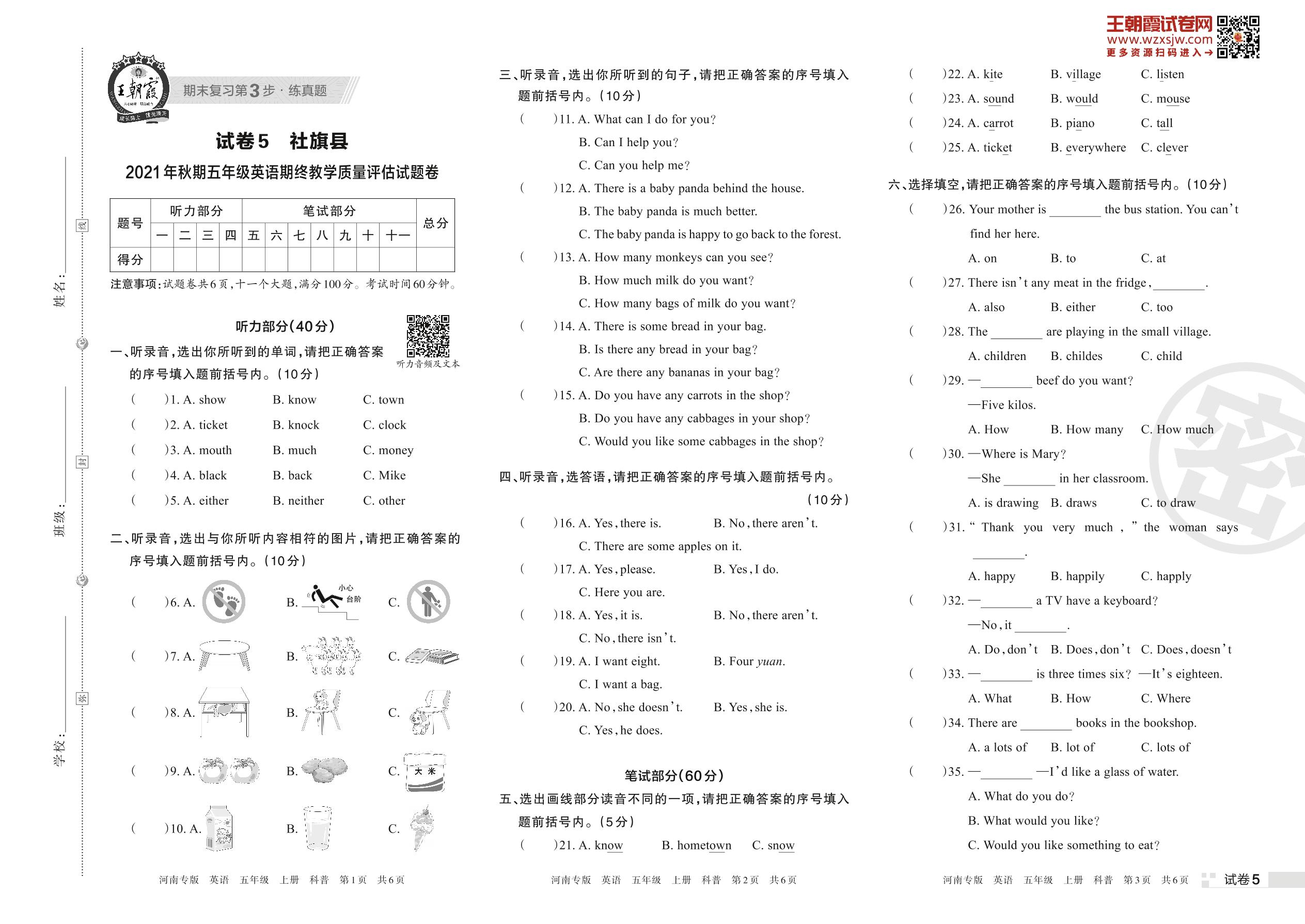 社旗县2021年秋期五年级英语期终教学质量评估试题卷(科普版)【5】