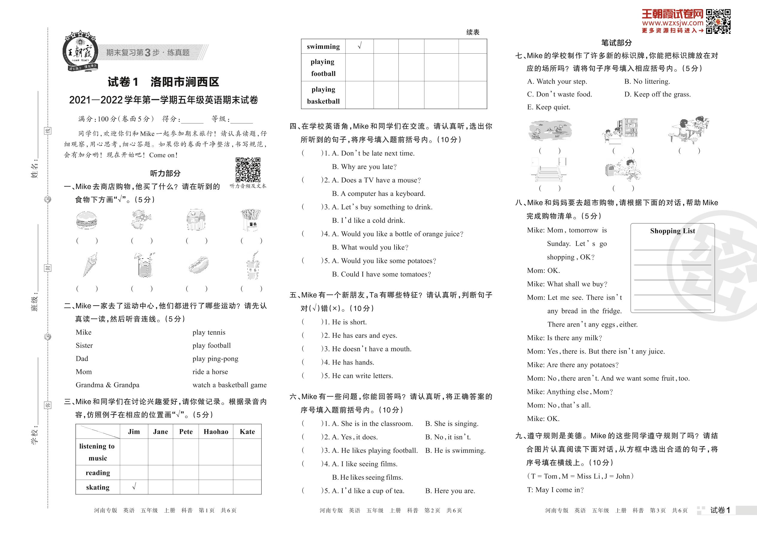 洛阳市涧西区2021—2022学年第一学期五年级英语期末试卷(科普版)【1】