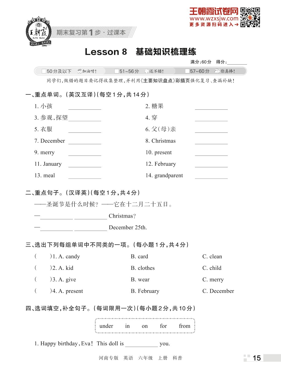 王朝霞期末过课本——Lesson 8 基础知识梳理练六年级上册英语(科普版)_R221111145356695